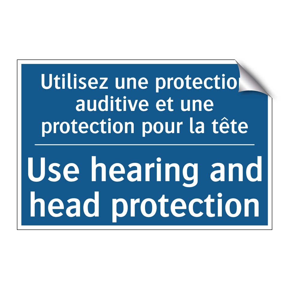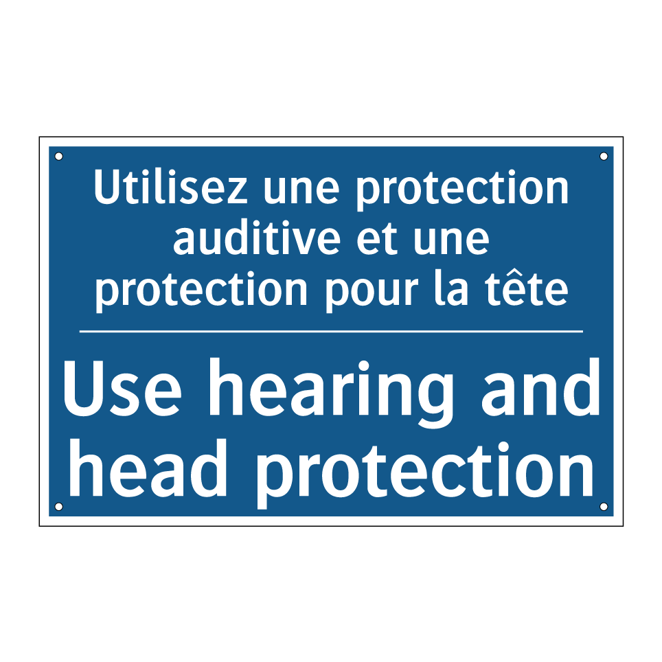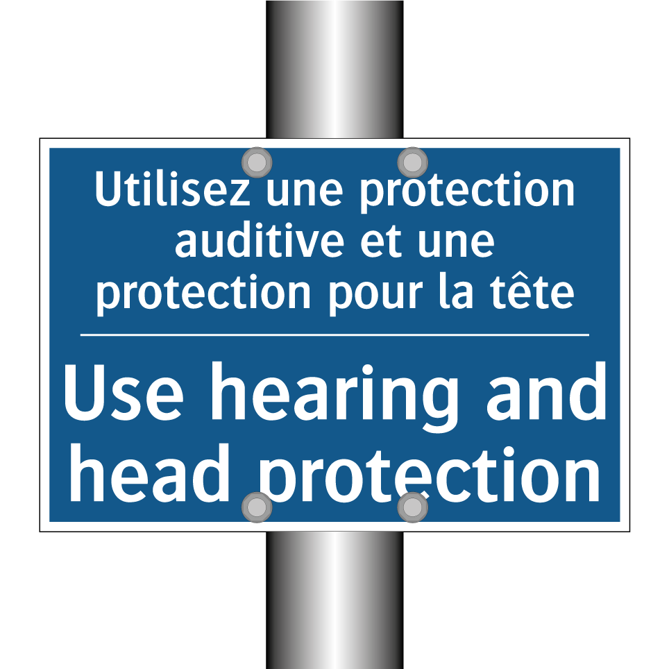 Panneau d'obligation bilingue avec texte en français : "Utilisez une protection auditive et une protection pour la tête", et en anglais : "Use hearing and head protection"