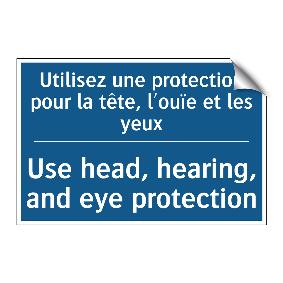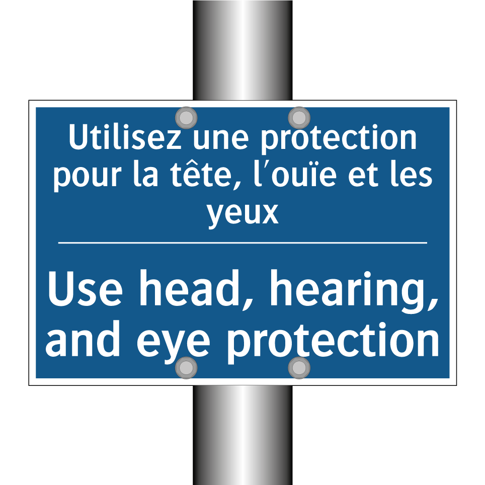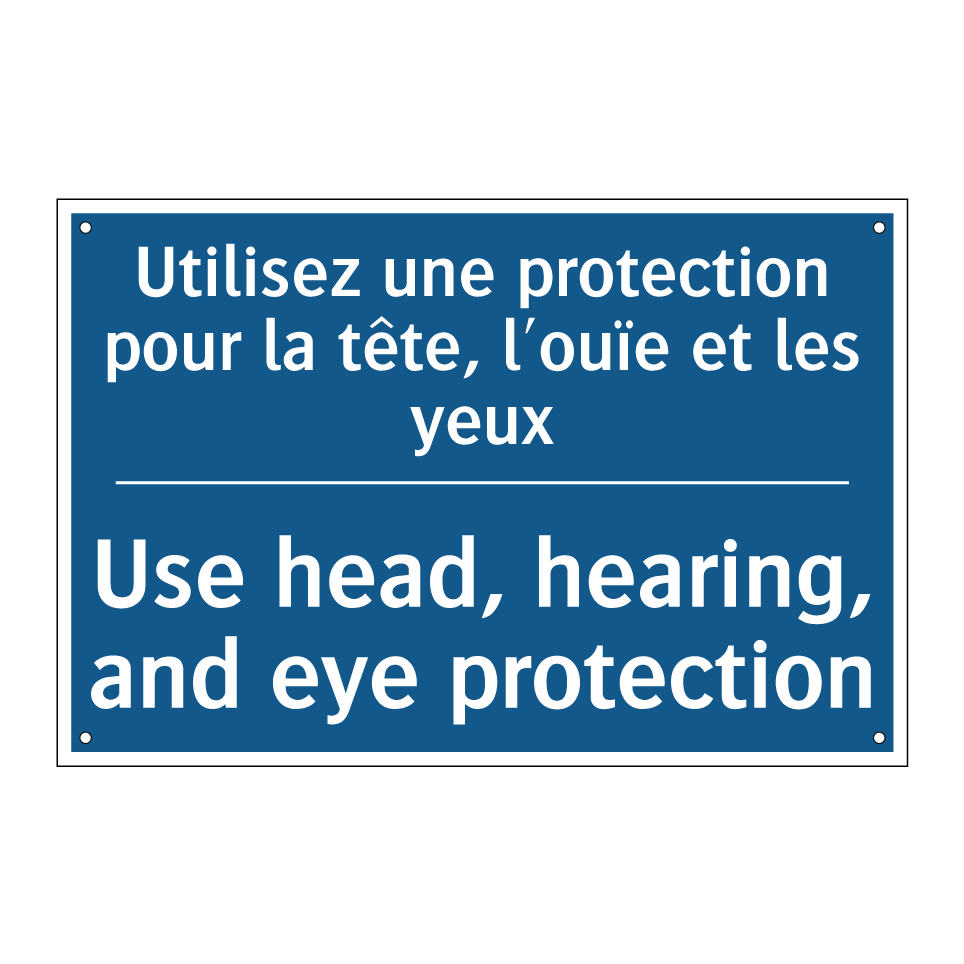 Panneau d'obligation bilingue avec texte en français : "Utilisez une protection pour la tête, l'ouïe et les yeux", et en anglais : "Use head, hearing, and eye protection"