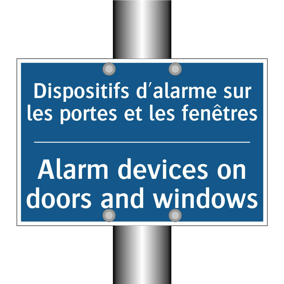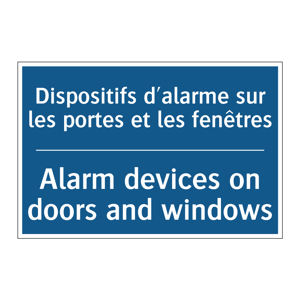 Panneau d'obligation bilingue avec texte en français : "Dispositifs d'alarme sur les portes et les fenêtres", et en anglais : "Alarm devices on doors and windows"