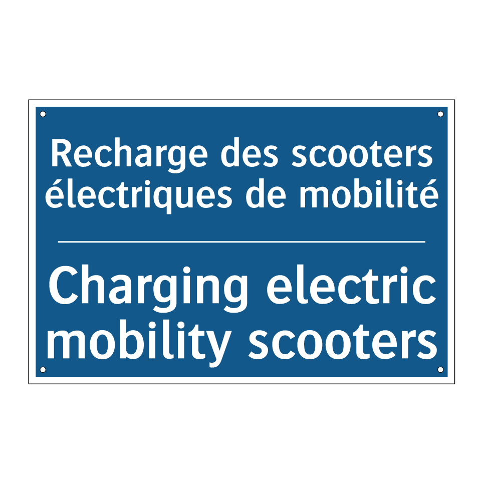 Panneau d'obligation bilingue avec texte en français : "Recharge des scooters électriques de mobilité", et en anglais : "Charging electric mobility scooters"