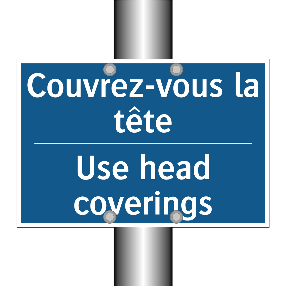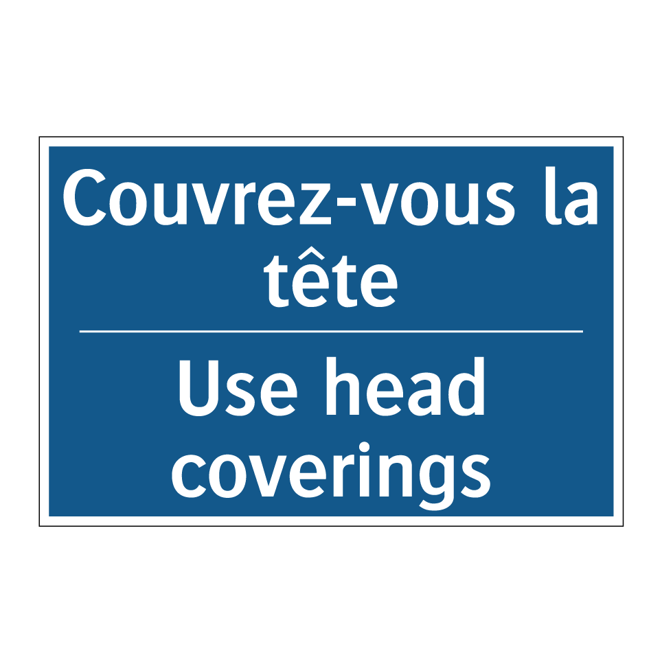 Panneau d'obligation bilingue avec texte en français : "Couvrez-vous la tête", et en anglais : "Use head coverings"