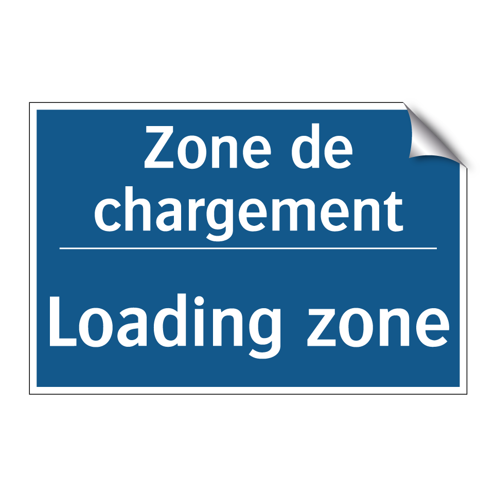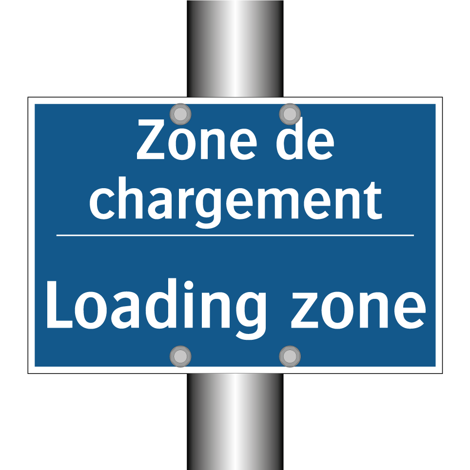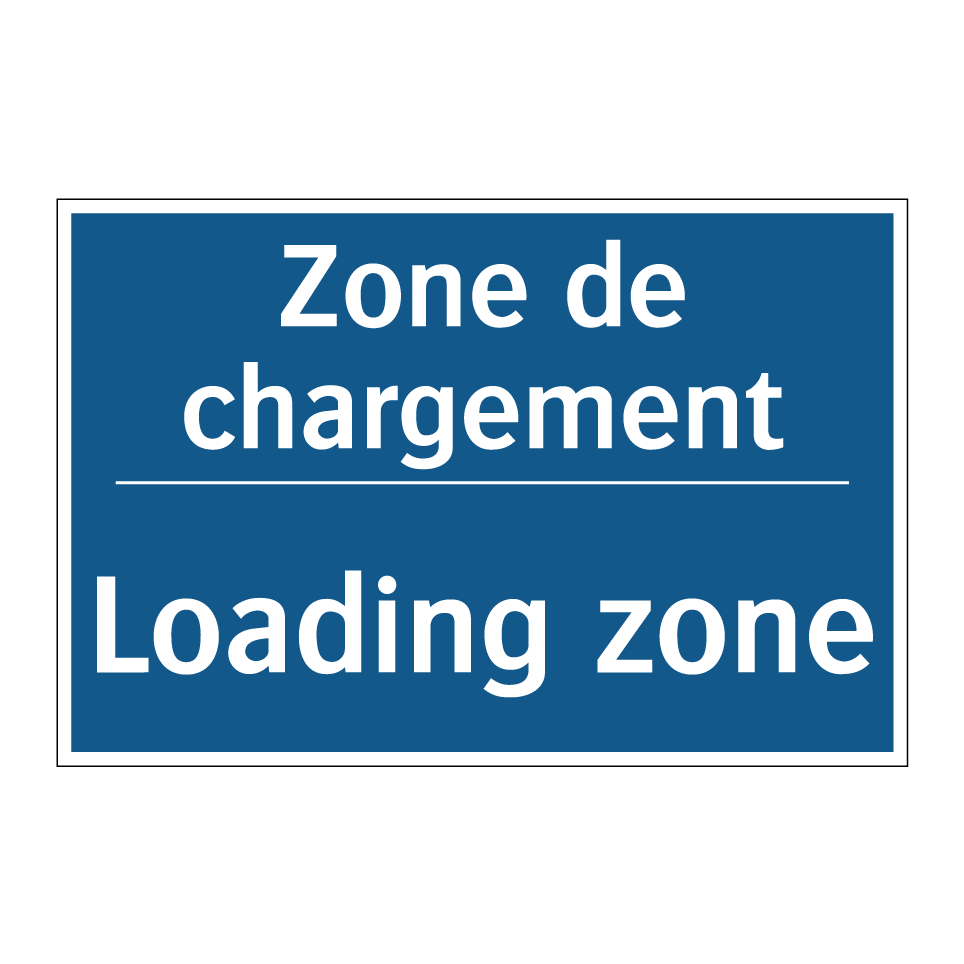 Panneau d'obligation bilingue avec texte en français : "Zone de chargement", et en anglais : "Loading zone"