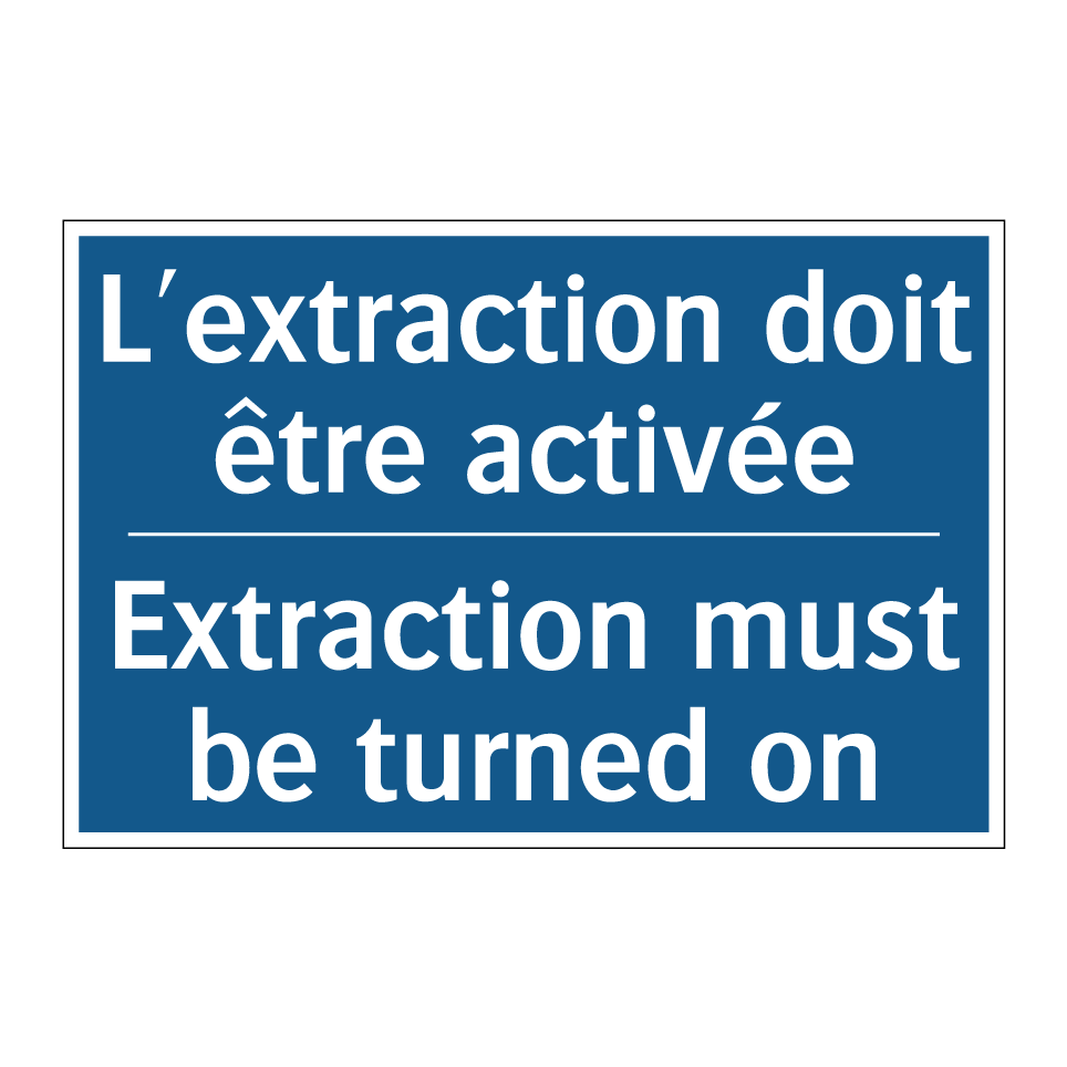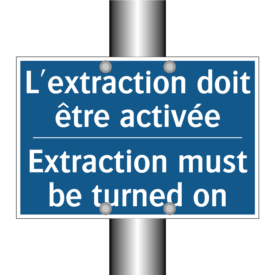 Panneau d'obligation bilingue avec texte en français : "L'extraction doit être activée", et en anglais : "Extraction must be turned on"