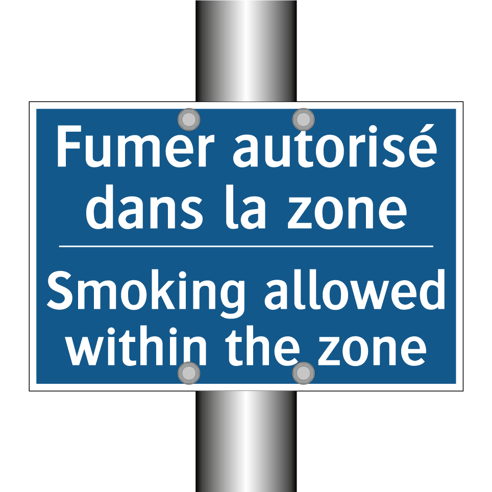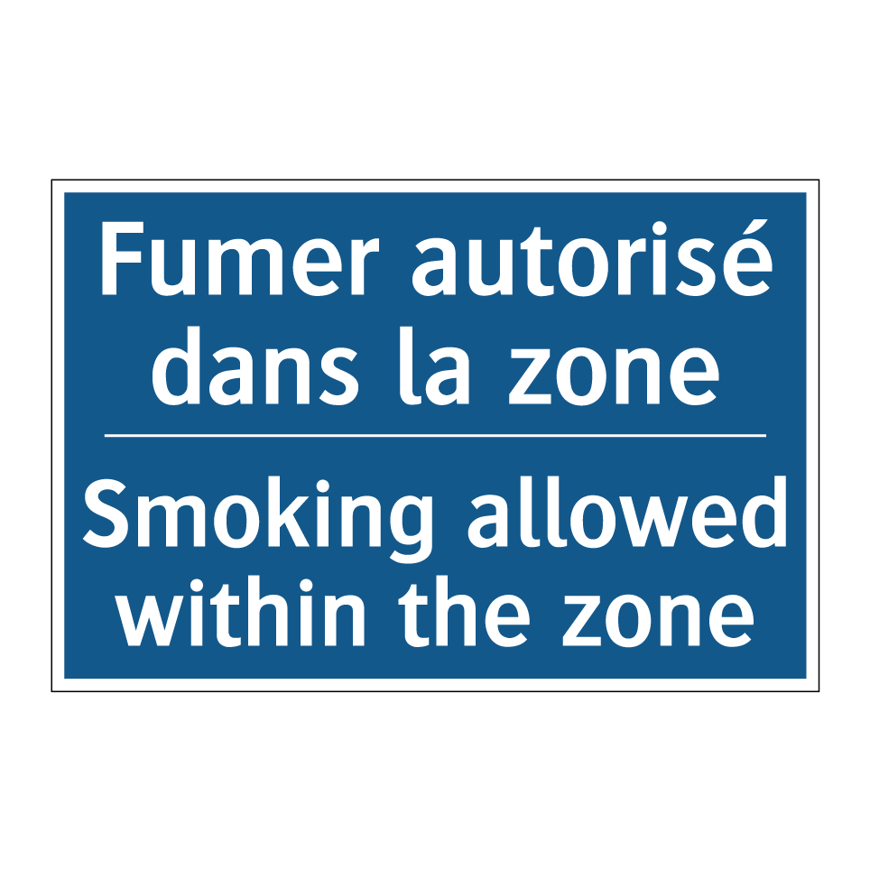 Panneau d'obligation bilingue avec texte en français : "Fumer autorisé dans la zone", et en anglais : "Smoking allowed within the zone"