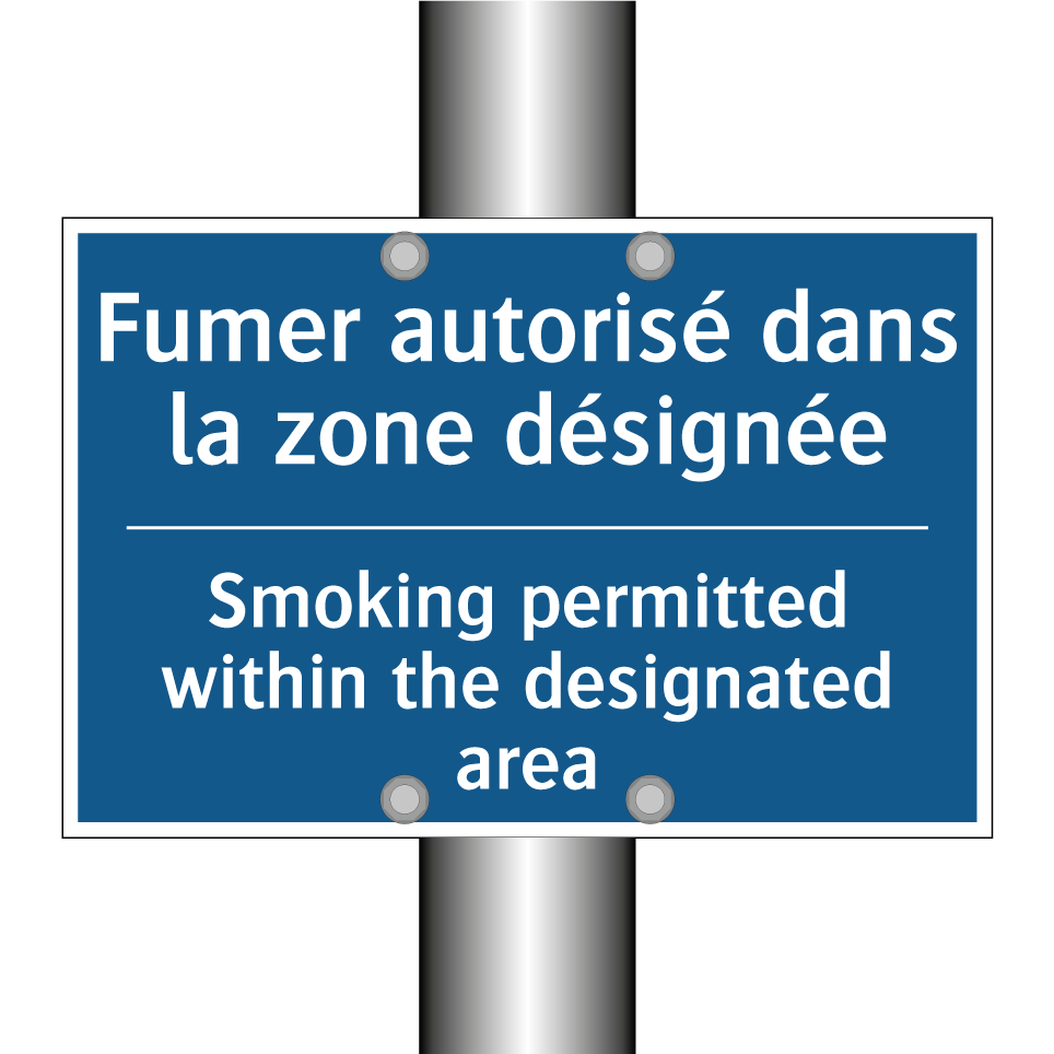 Panneau d'obligation bilingue avec texte en français : "Fumer autorisé dans la zone désignée", et en anglais : "Smoking permitted within the designated area"