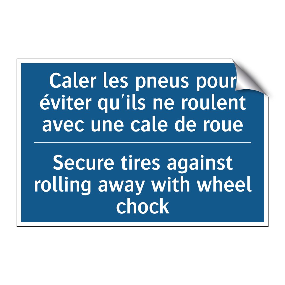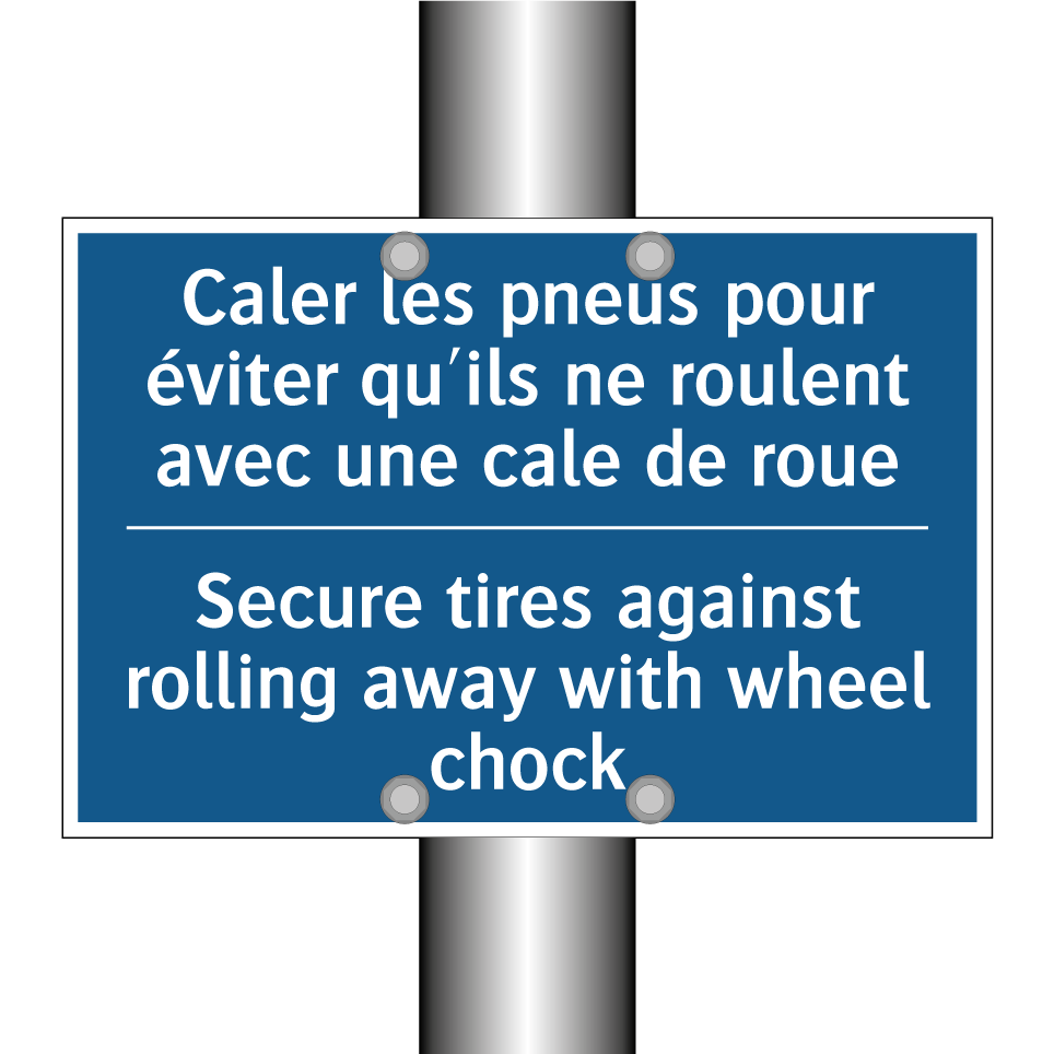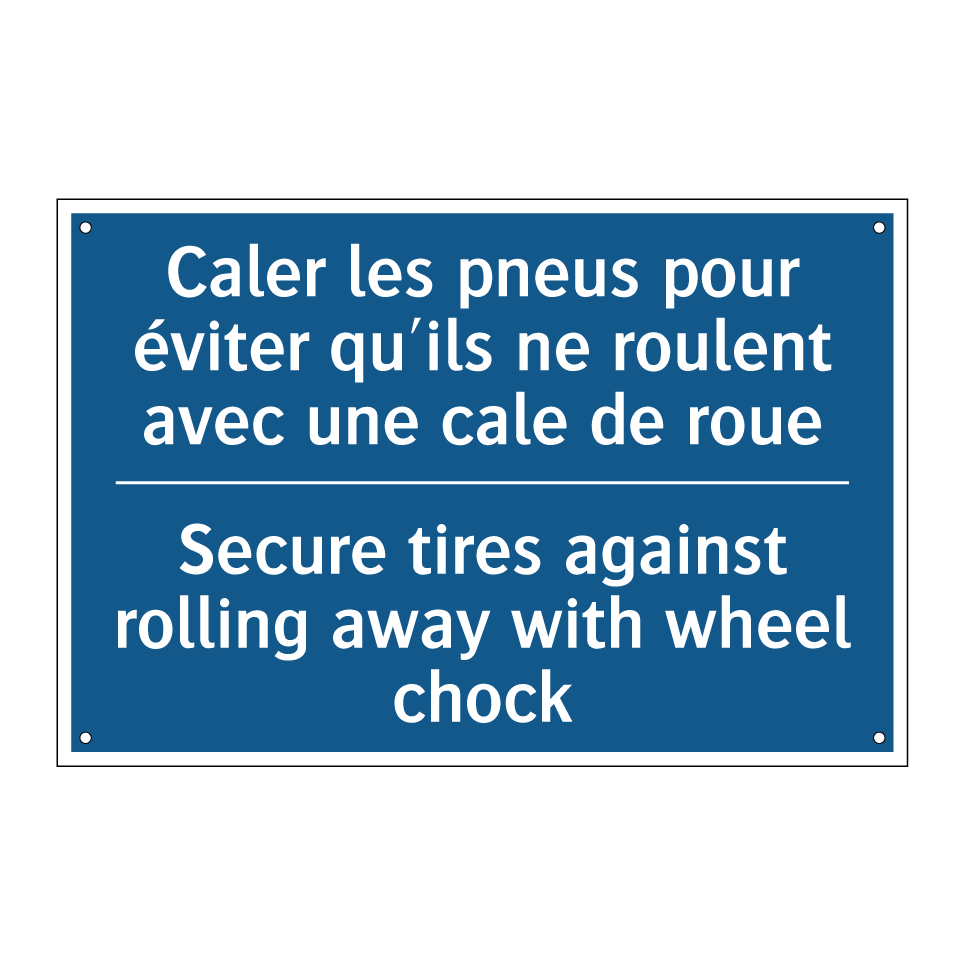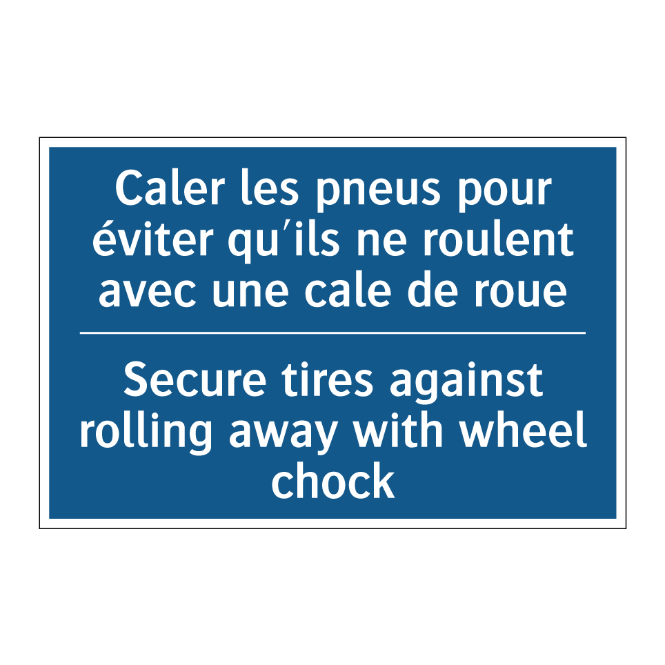 Panneau d'obligation bilingue avec texte en français : "Caler les pneus pour éviter qu'ils ne roulent avec une cale de roue", et en anglais : "Secure tires against rolling away with wheel chock"