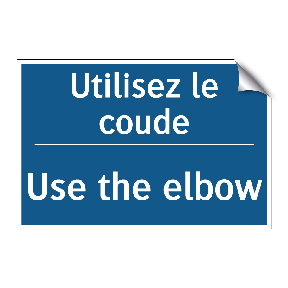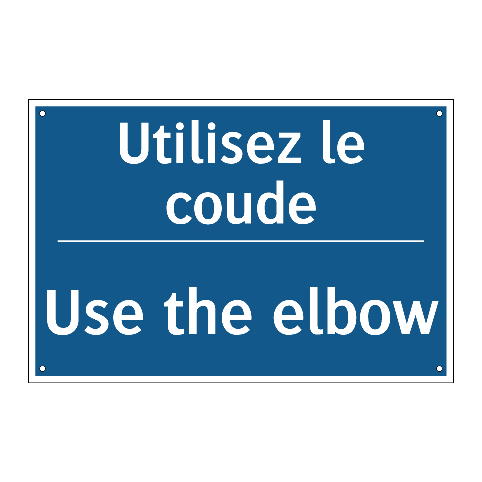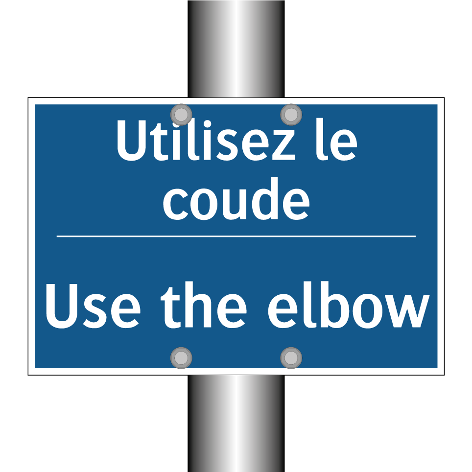Panneau d'obligation bilingue avec texte en français : "Utilisez le coude", et en anglais : "Use the elbow"