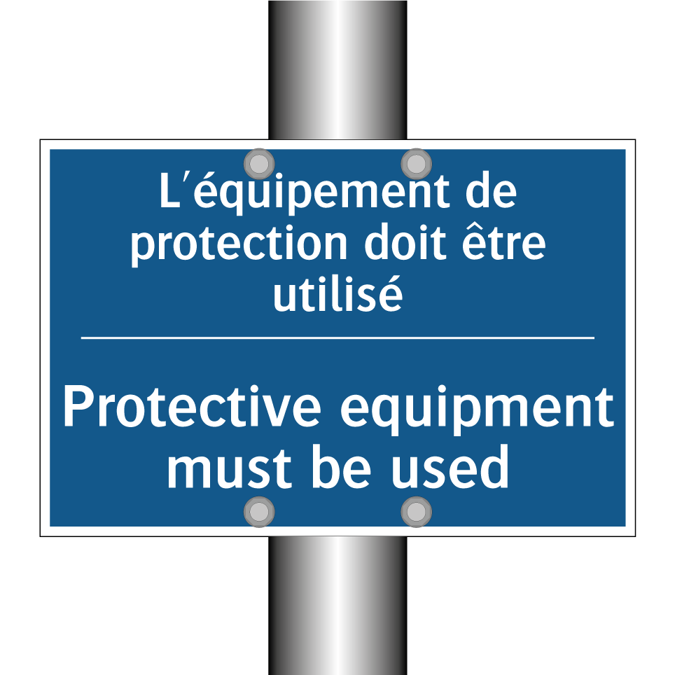 Panneau d'obligation bilingue avec texte en français : "L'équipement de protection doit être utilisé", et en anglais : "Protective equipment must be used"