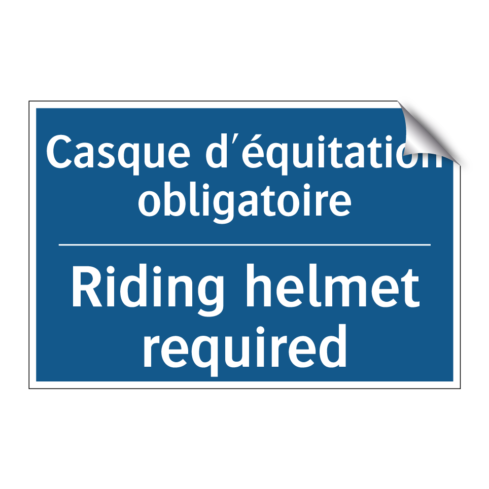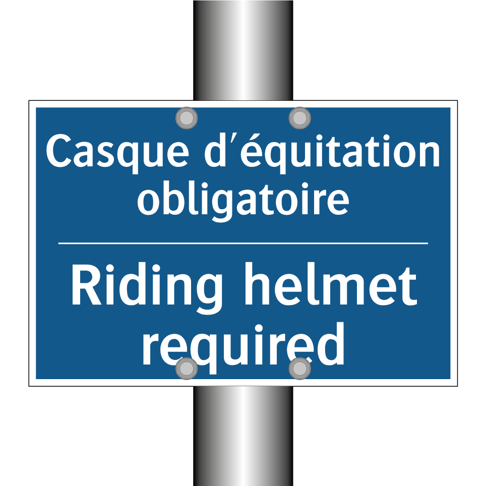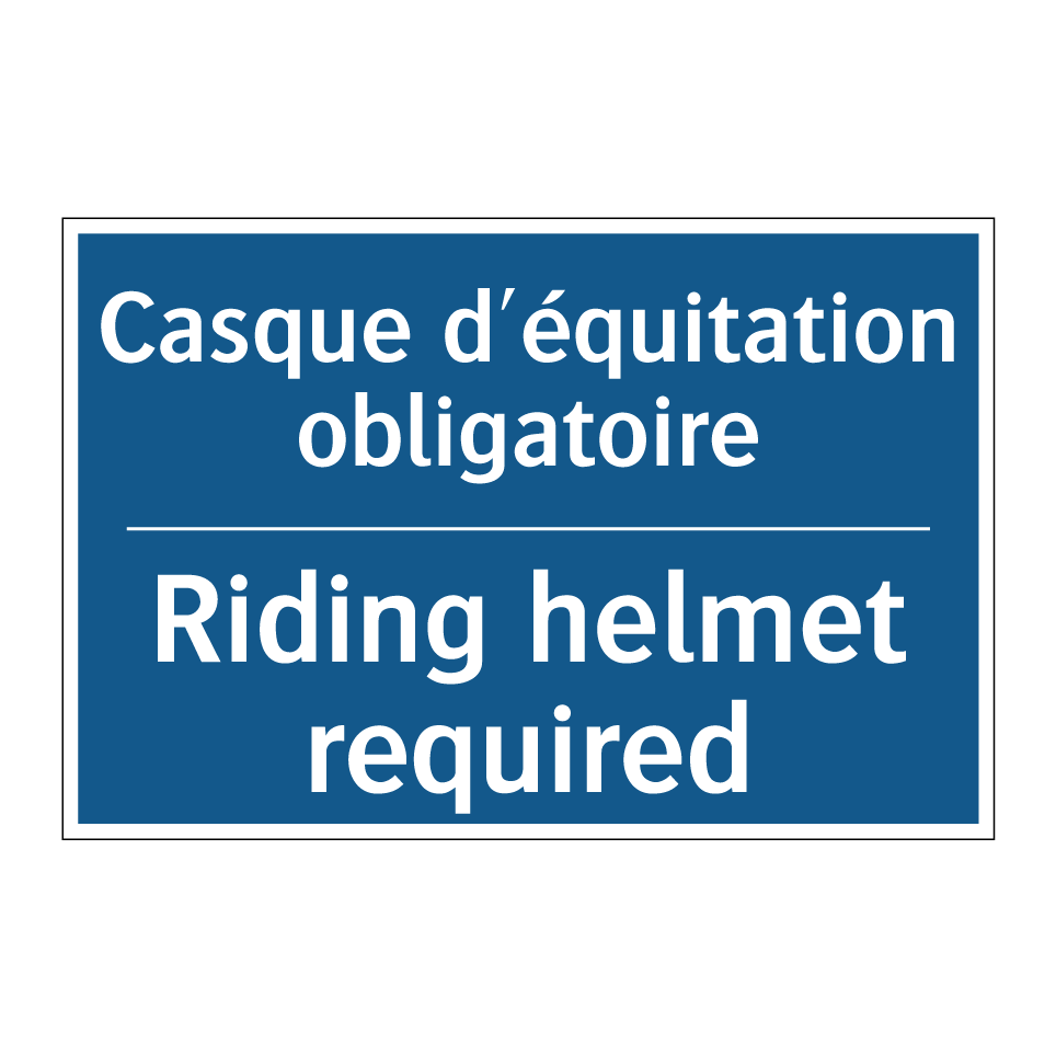 Panneau d'obligation bilingue avec texte en français : "Casque d'équitation obligatoire", et en anglais : "Riding helmet required"