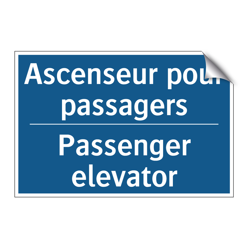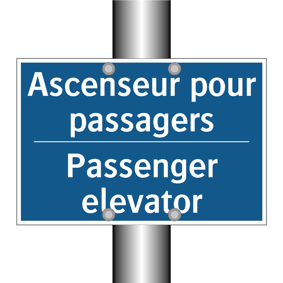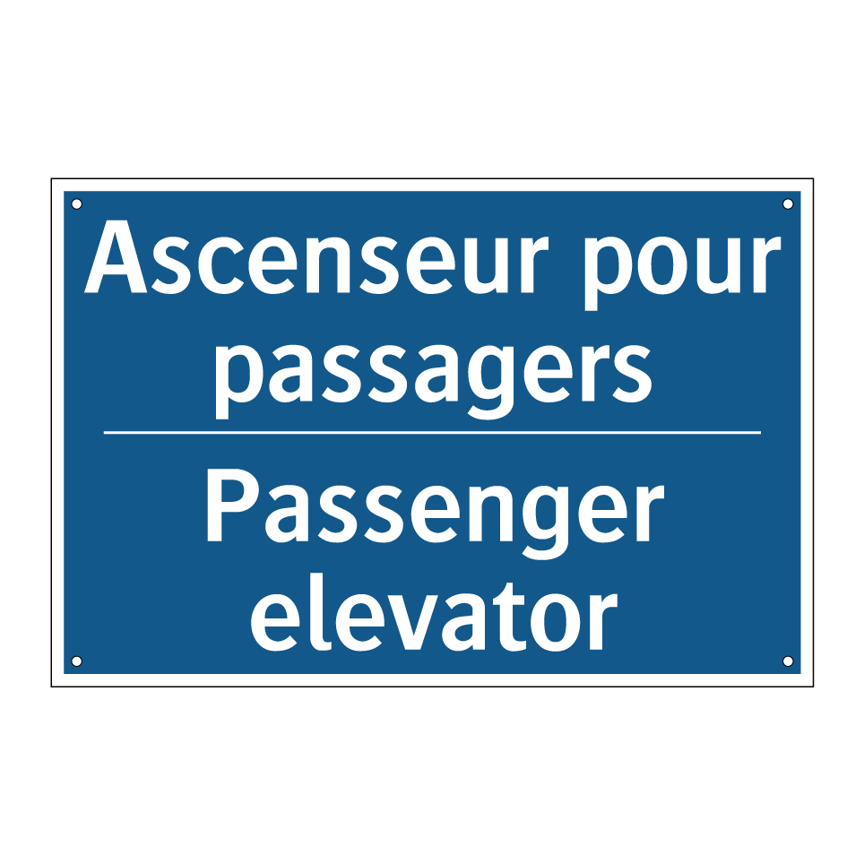 Panneau d'obligation bilingue avec texte en français : "Ascenseur pour passagers", et en anglais : "Passenger elevator"