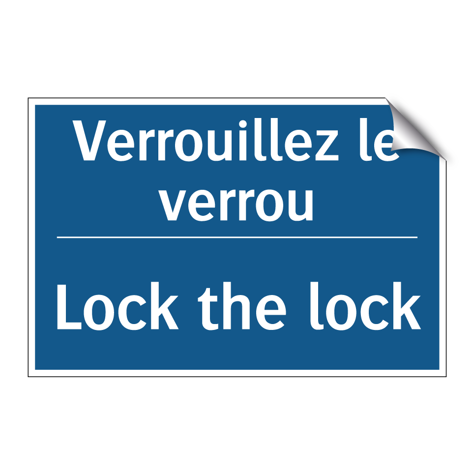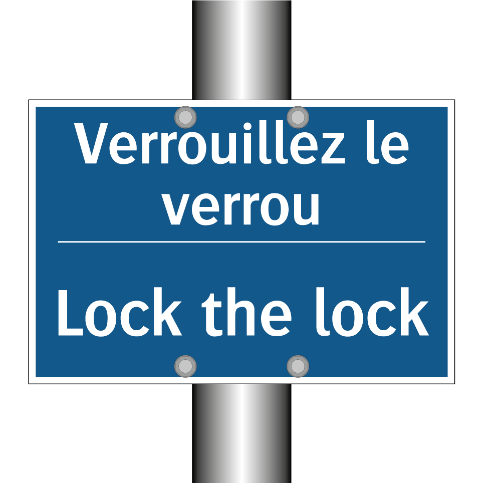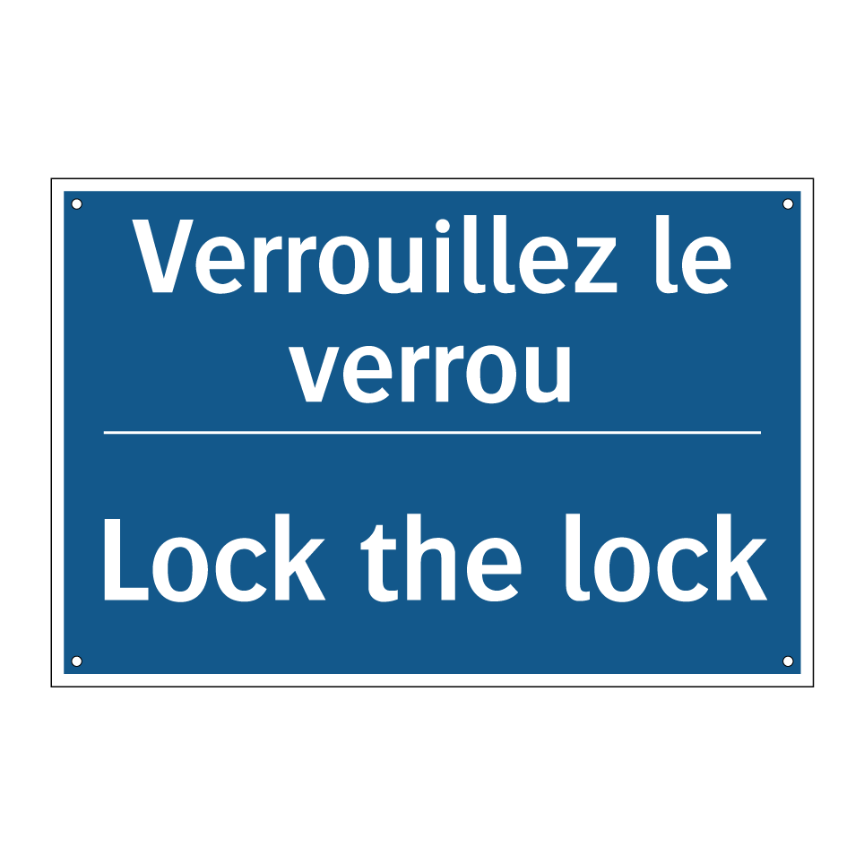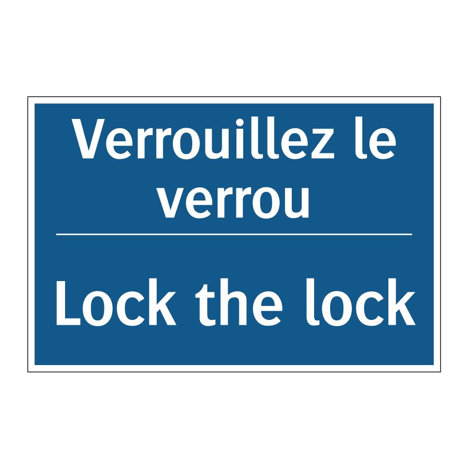 Panneau d'obligation bilingue avec texte en français : "Verrouillez le verrou", et en anglais : "Lock the lock"
