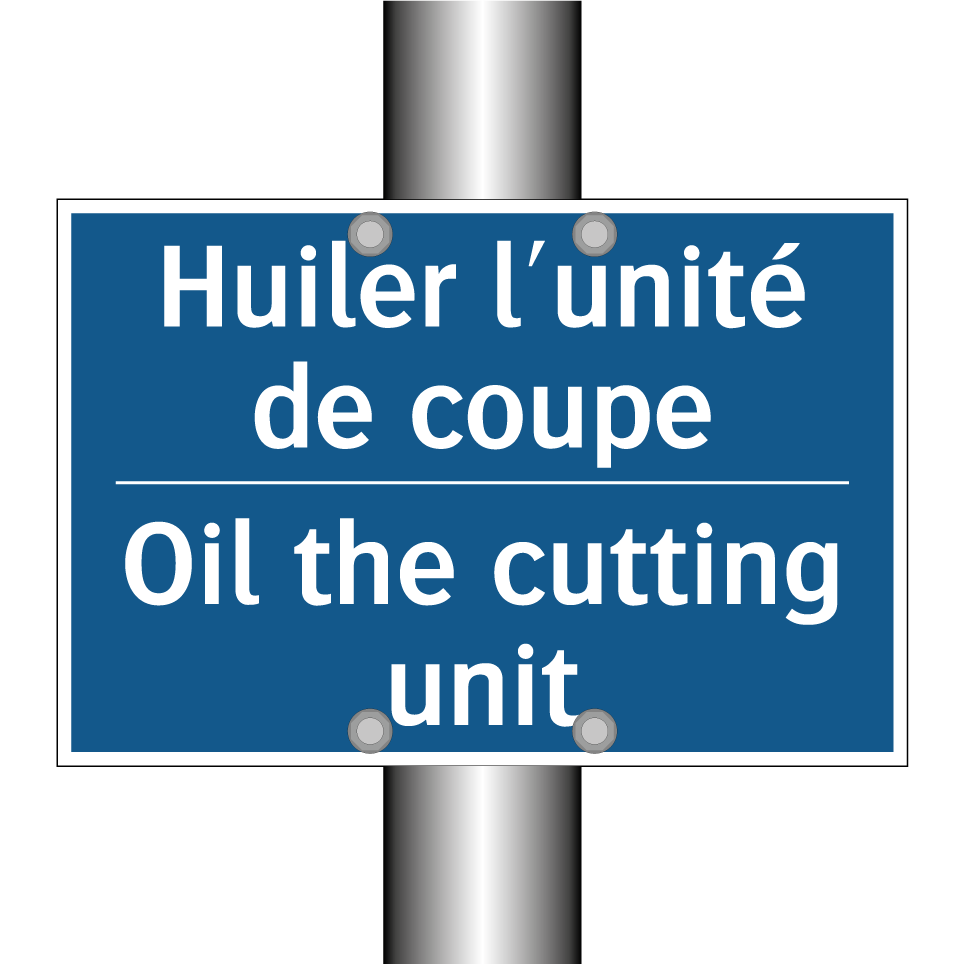 Panneau d'obligation bilingue avec texte en français : "Huiler l'unité de coupe", et en anglais : "Oil the cutting unit"