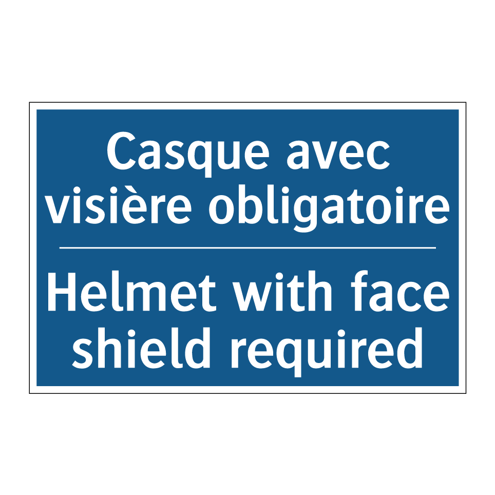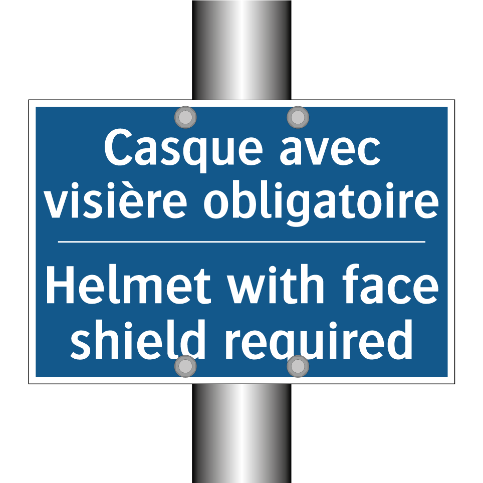 Panneau d'obligation bilingue avec texte en français : "Casque avec visière obligatoire", et en anglais : "Helmet with face shield required"