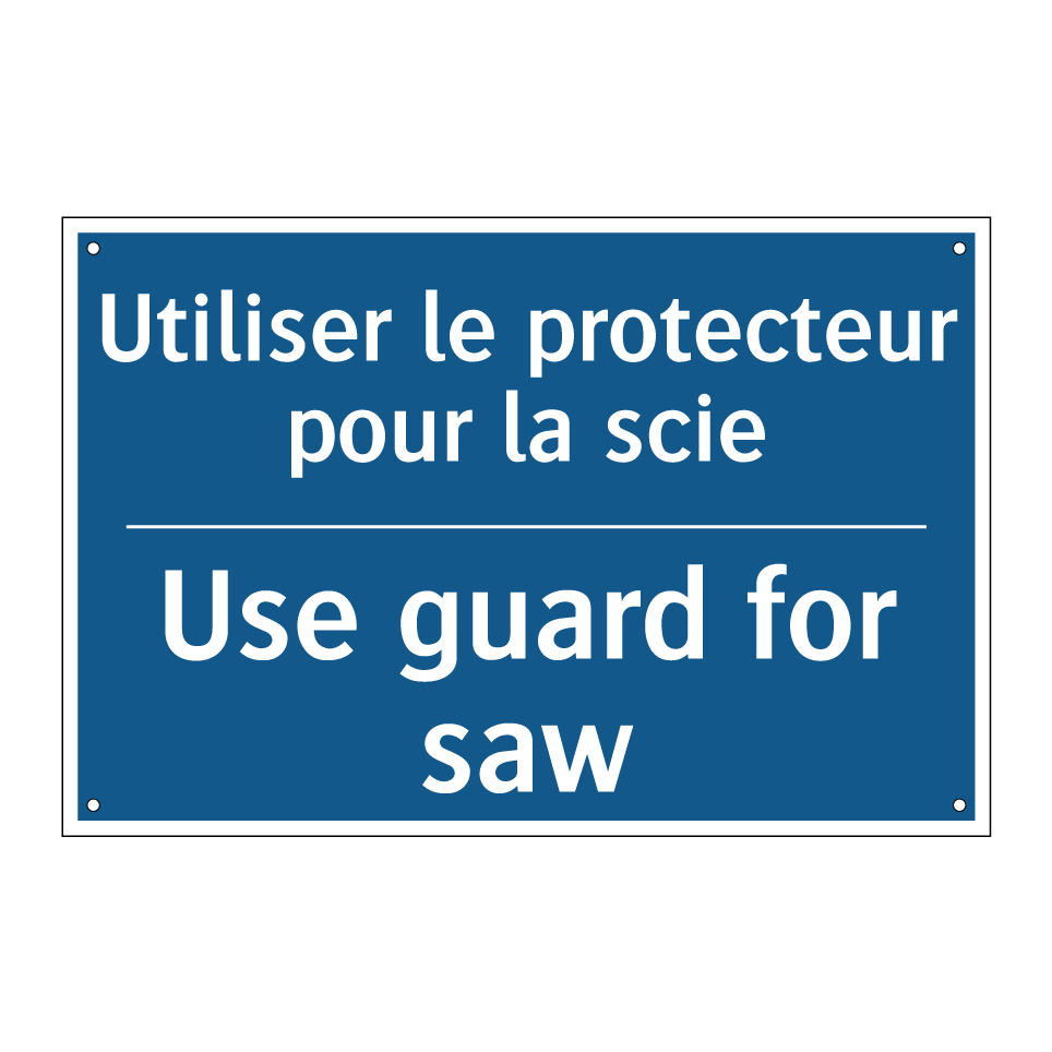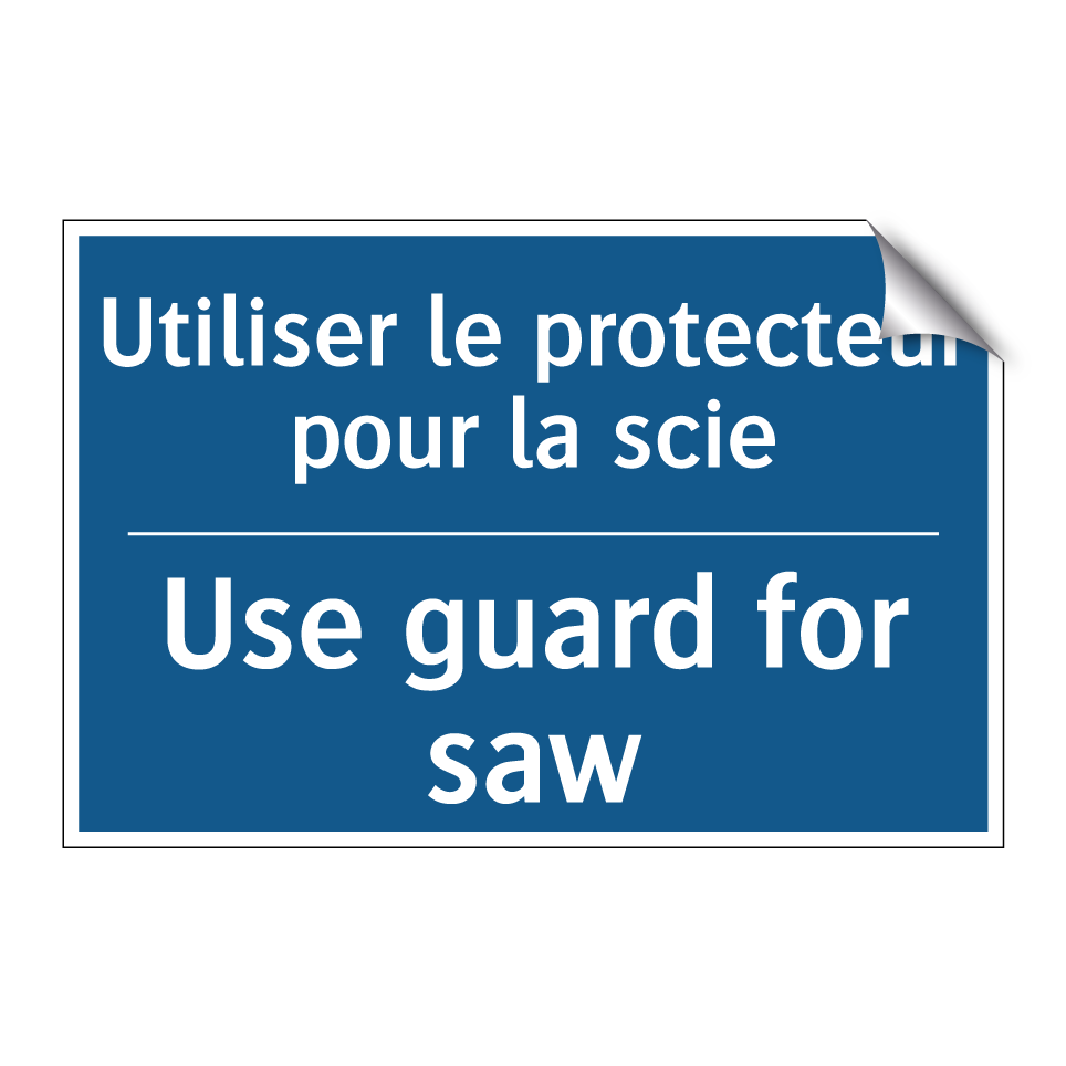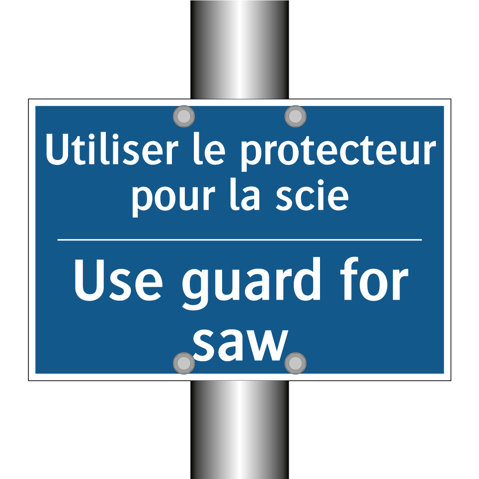Panneau d'obligation bilingue avec texte en français : "Utiliser le protecteur pour la scie", et en anglais : "Use guard for saw"