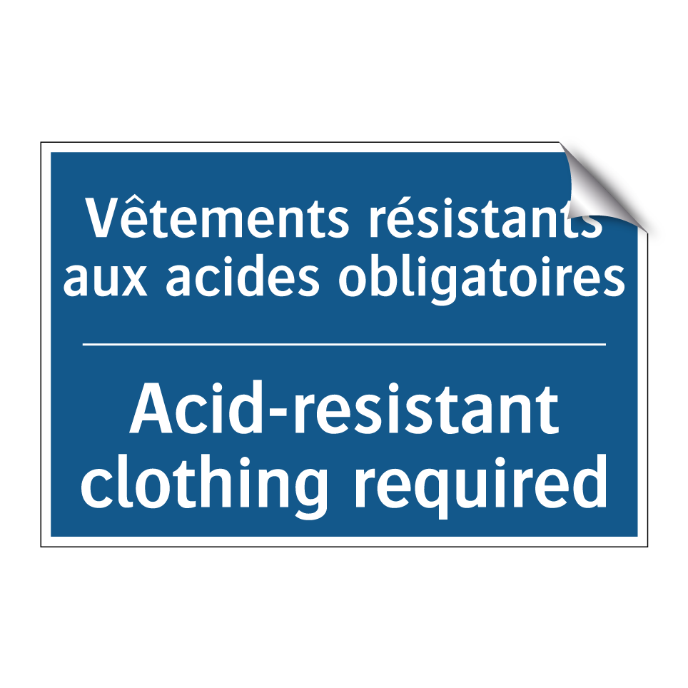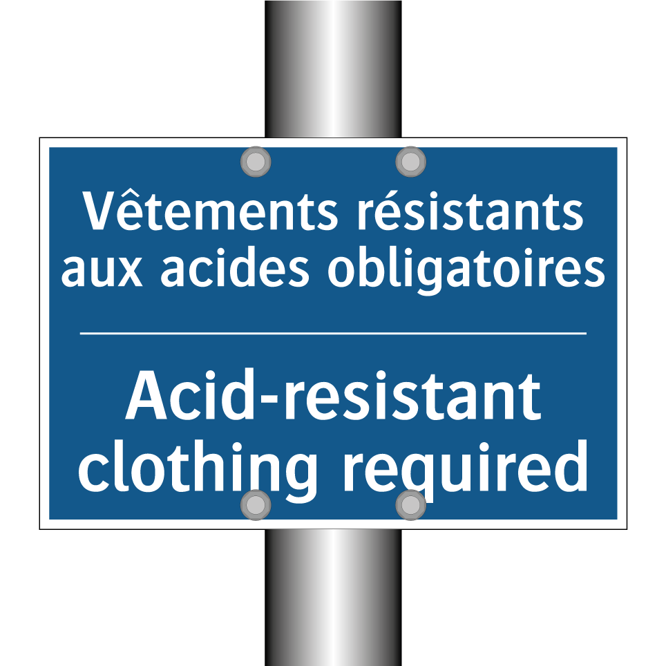 Panneau d'obligation bilingue avec texte en français : "Vêtements résistants aux acides obligatoires", et en anglais : "Acid-resistant clothing required"