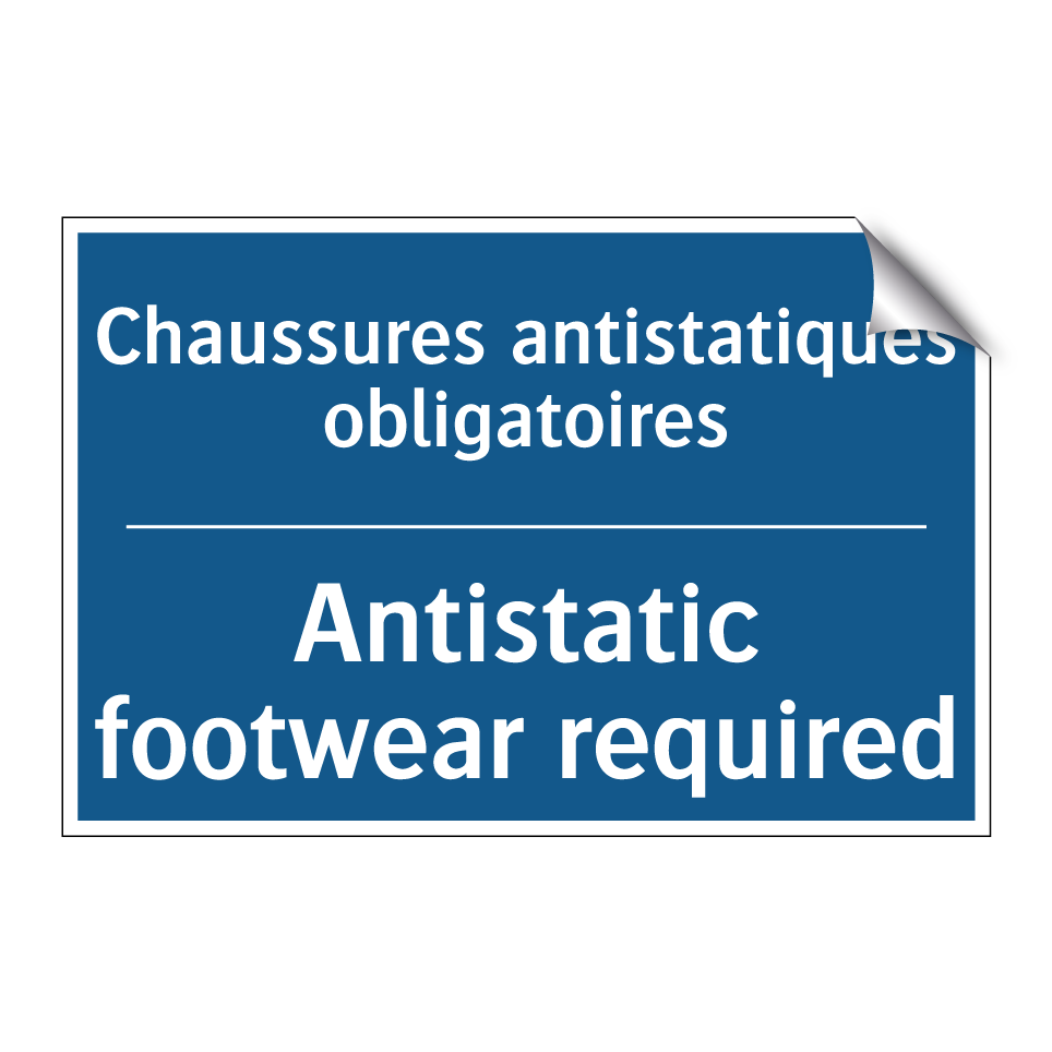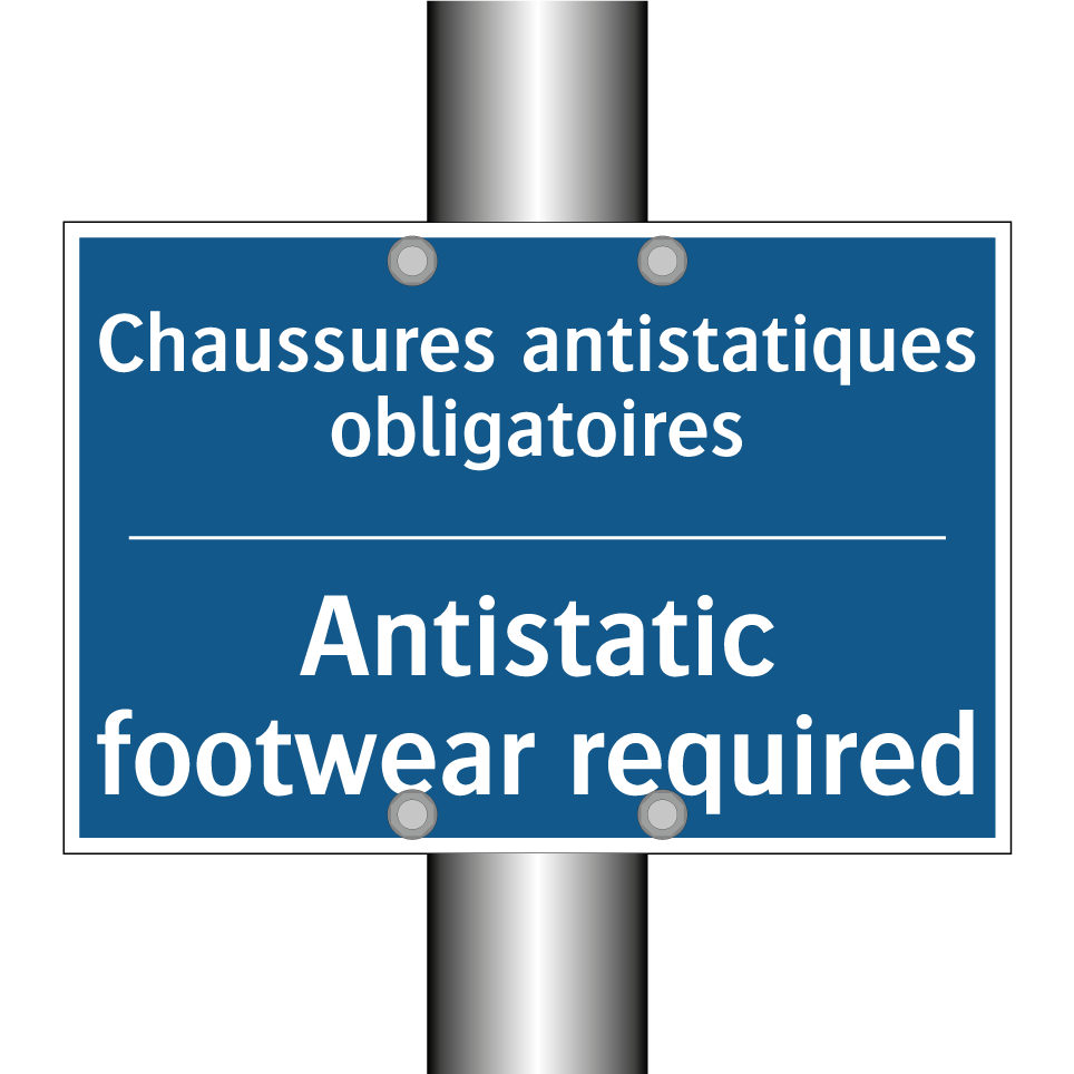 Panneau d'obligation bilingue avec texte en français : "Chaussures antistatiques obligatoires", et en anglais : "Antistatic footwear required"