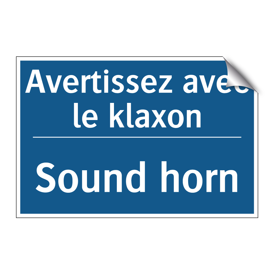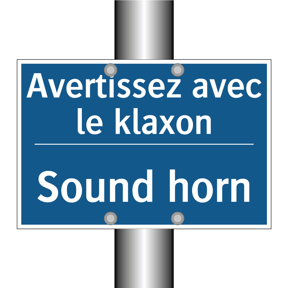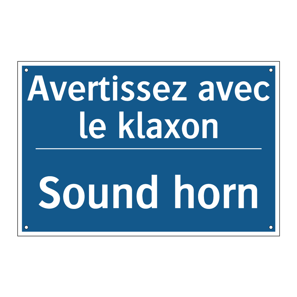 Panneau d'obligation bilingue avec texte en français : "Avertissez avec le klaxon", et en anglais : "Sound horn"