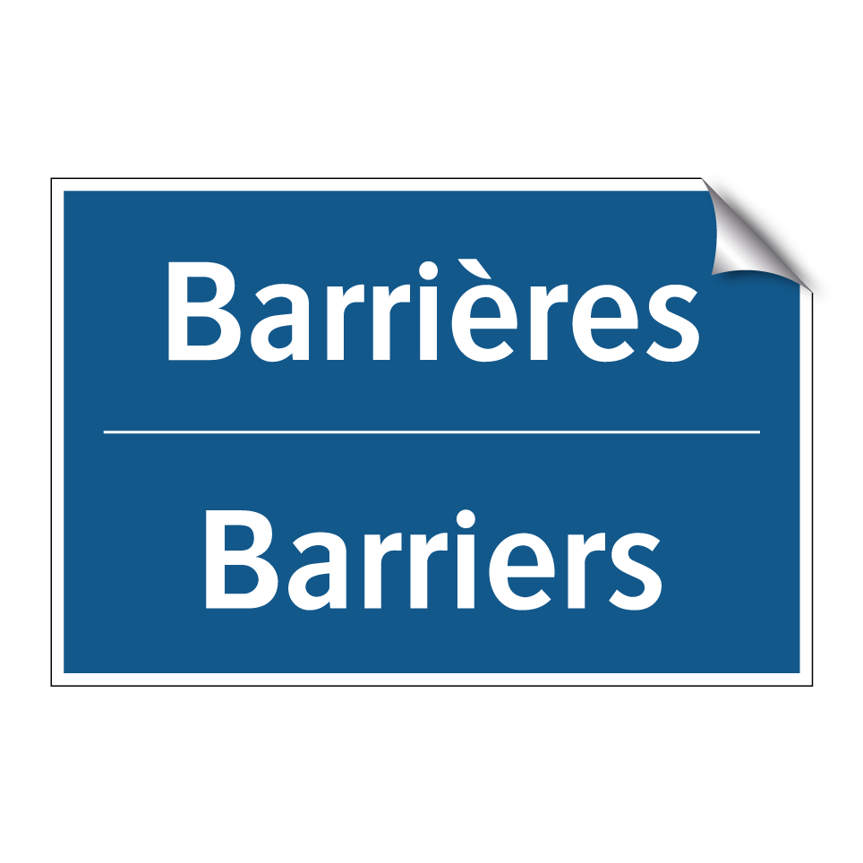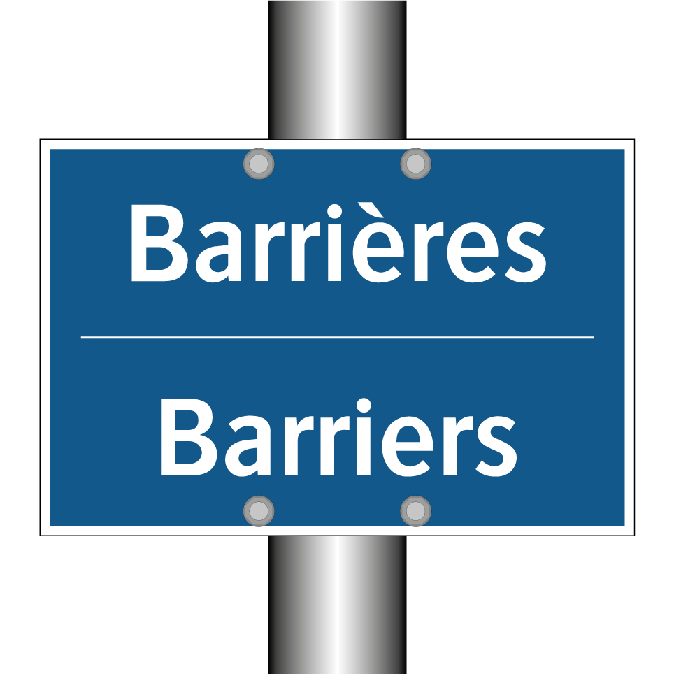 Panneau d'obligation bilingue avec texte en français : "Barrières", et en anglais : "Barriers"