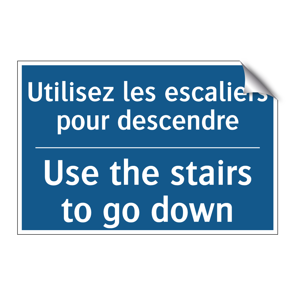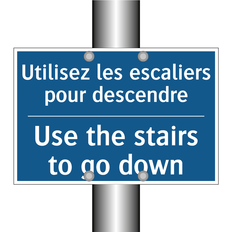 Panneau d'obligation bilingue avec texte en français : "Utilisez les escaliers pour descendre", et en anglais : "Use the stairs to go down"