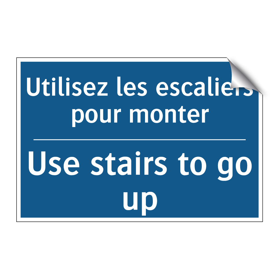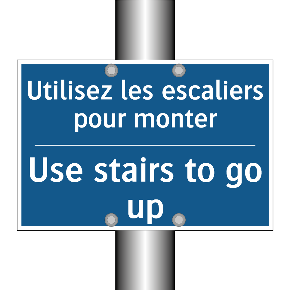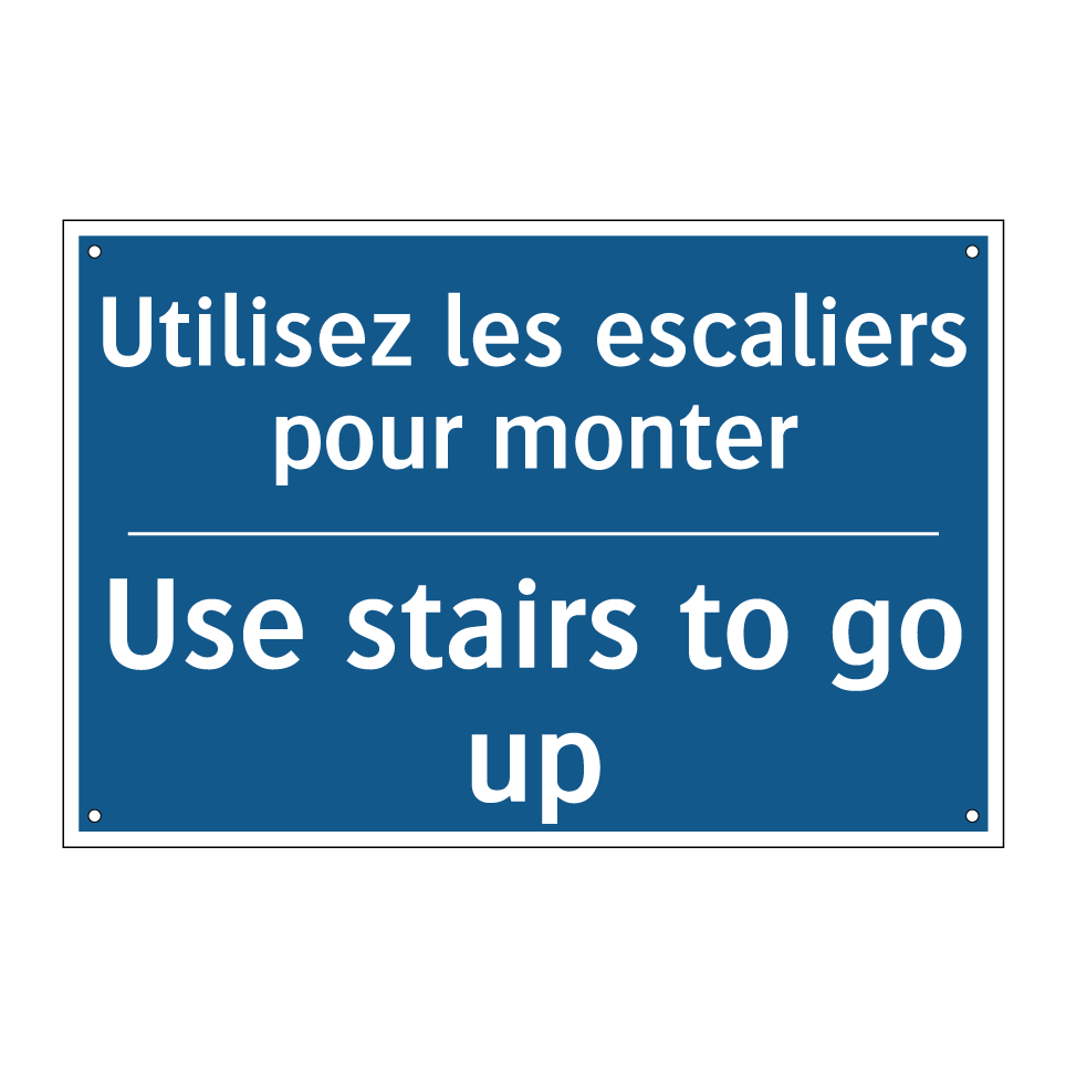 Panneau d'obligation bilingue avec texte en français : "Utilisez les escaliers pour monter", et en anglais : "Use stairs to go up"