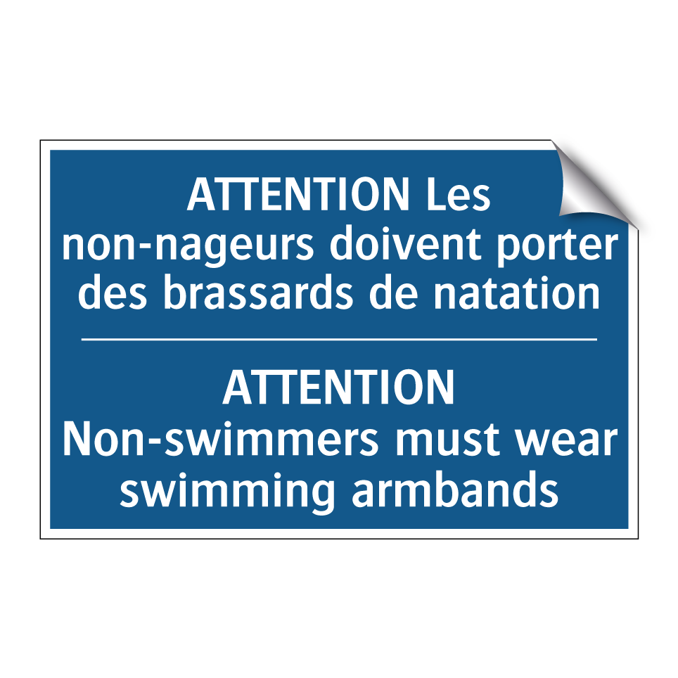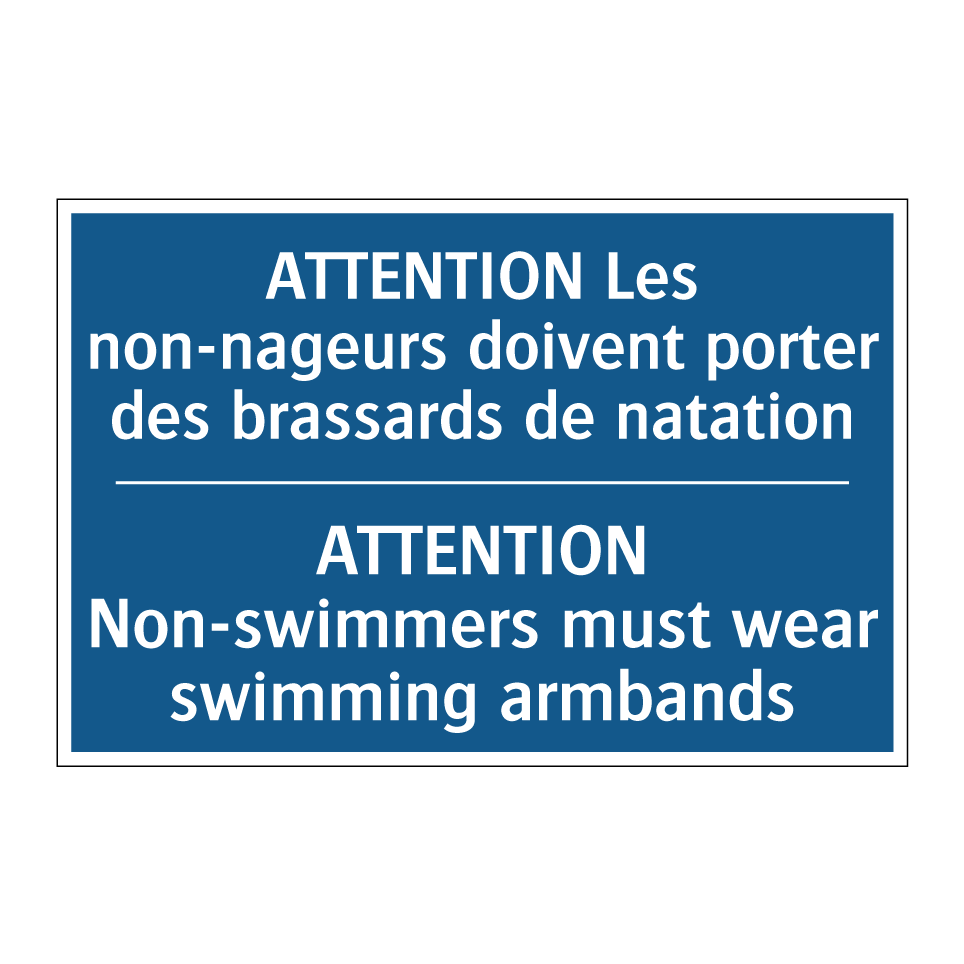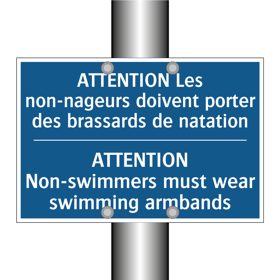 Panneau d'obligation bilingue avec texte en français : "ATTENTION Les non-nageurs doivent porter des brassards de natation", et en anglais : "ATTENTION Non-swimmers must wear swimming armbands"