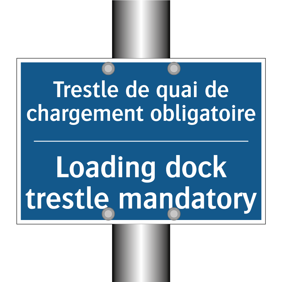 Panneau d'obligation bilingue avec texte en français : "Trestle de quai de chargement obligatoire", et en anglais : "Loading dock trestle mandatory"