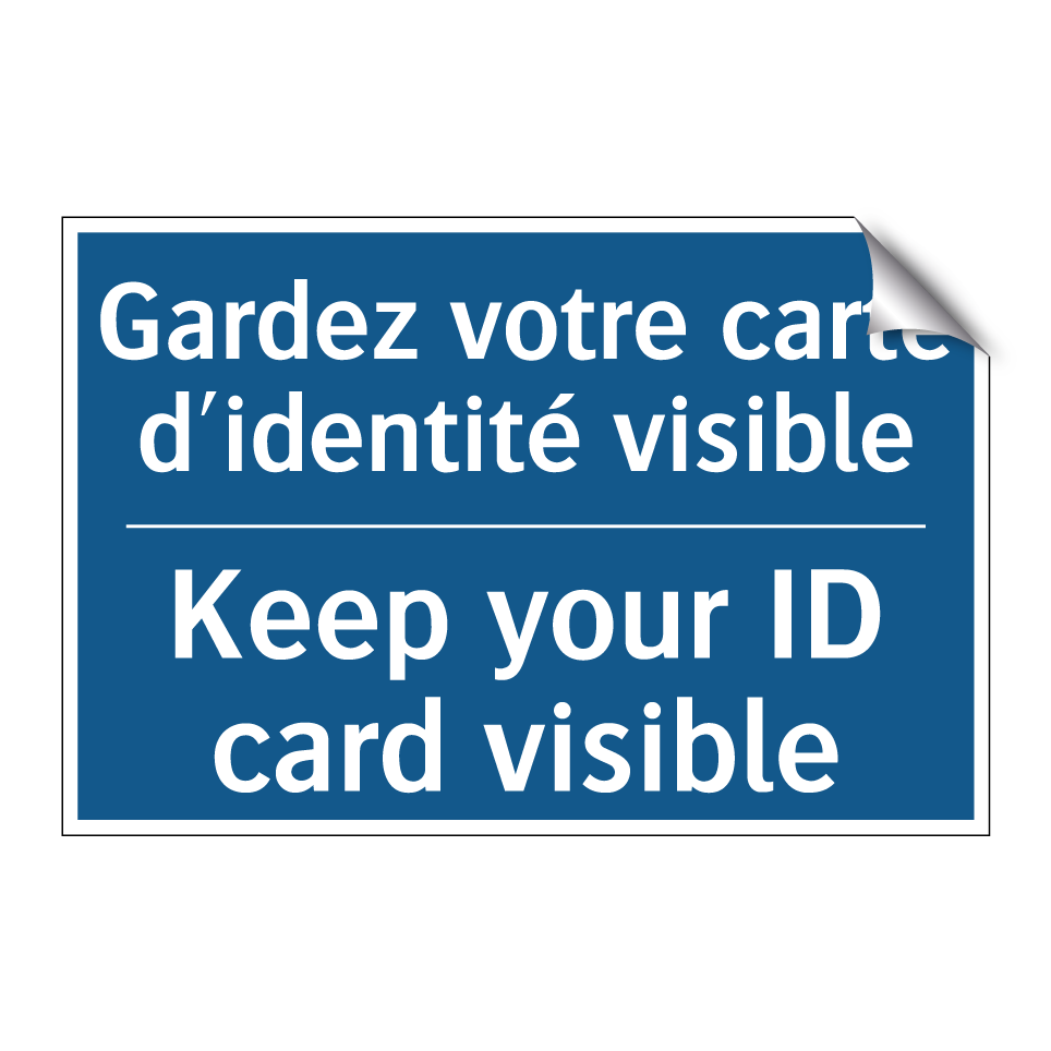 Panneau d'obligation bilingue avec texte en français : "Gardez votre carte d'identité visible", et en anglais : "Keep your ID card visible"