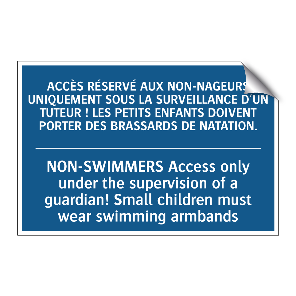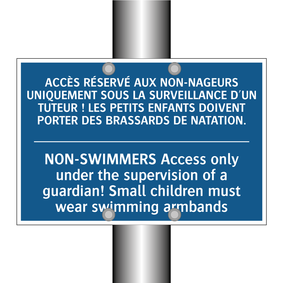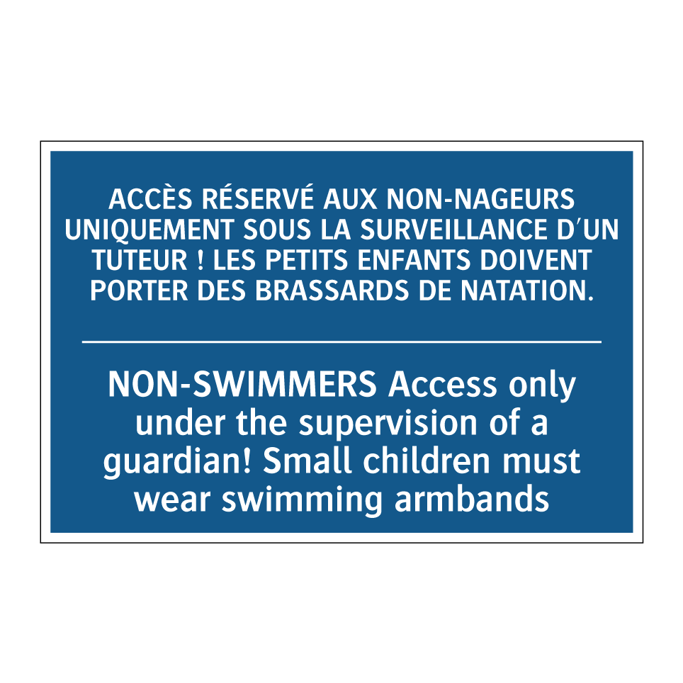 Panneau d'obligation bilingue avec texte en français : "ACCÈS RÉSERVÉ AUX NON-NAGEURS UNIQUEMENT SOUS LA SURVEILLANCE D'UN TUTEUR ! LES PETITS ENFANTS DOIVENT PORTER DES BRASSARDS DE NATATION.", et en anglais : "NON-SWIMMERS Access only under the supervision of a guardian! Small children must wear swimming armbands"