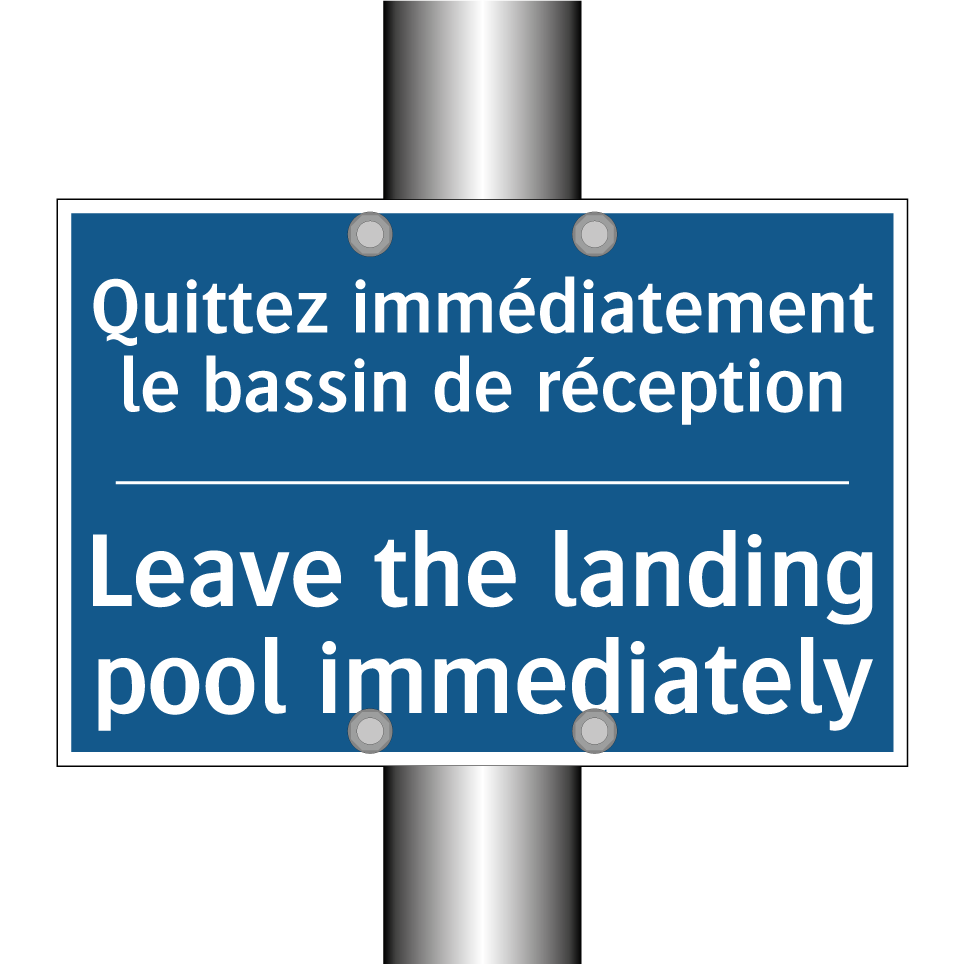 Panneau d'obligation bilingue avec texte en français : "Quittez immédiatement le bassin de réception", et en anglais : "Leave the landing pool immediately"