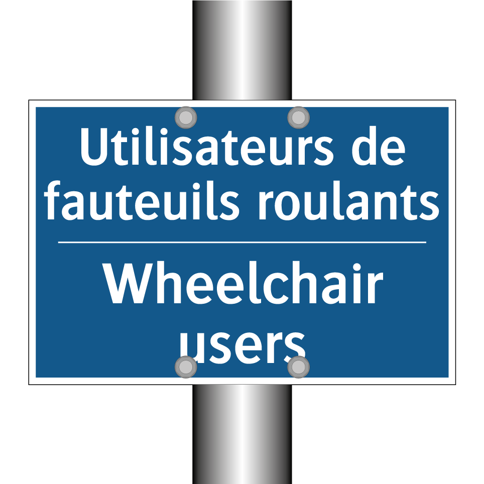 Panneau d'obligation bilingue avec texte en français : "Utilisateurs de fauteuils roulants", et en anglais : "Wheelchair users"