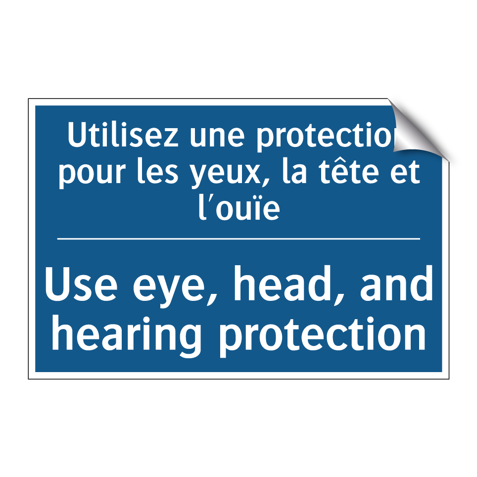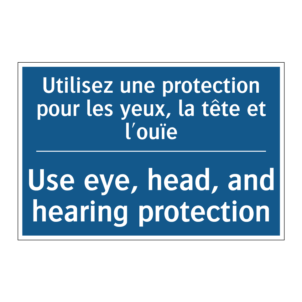 Panneau d'obligation bilingue avec texte en français : "Utilisez une protection pour les yeux, la tête et l'ouïe", et en anglais : "Use eye, head, and hearing protection"
