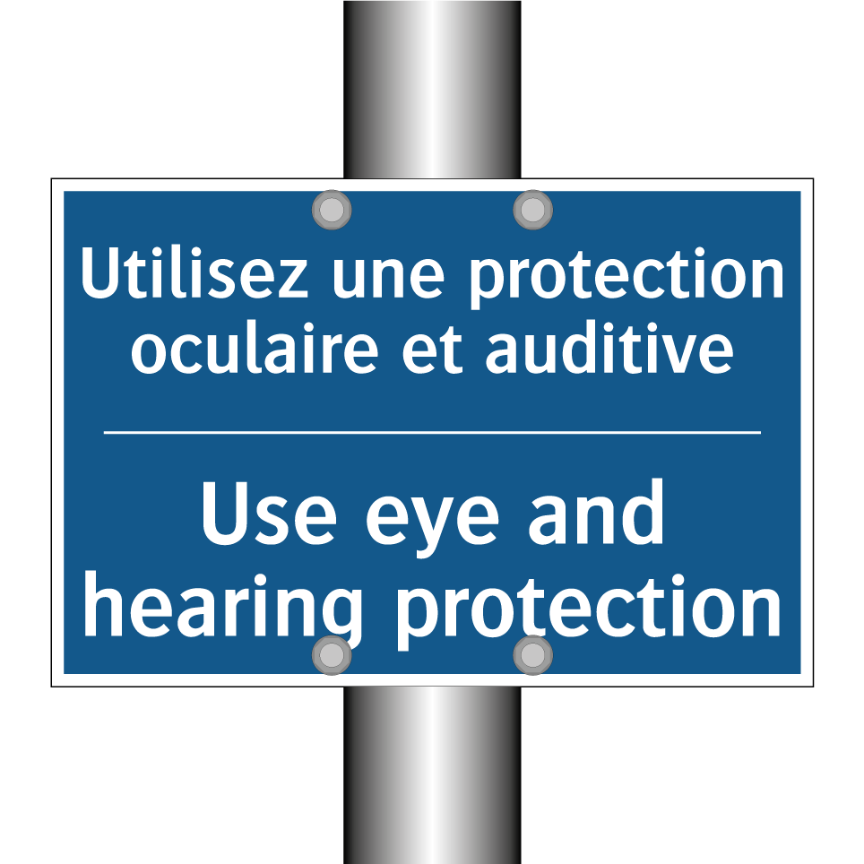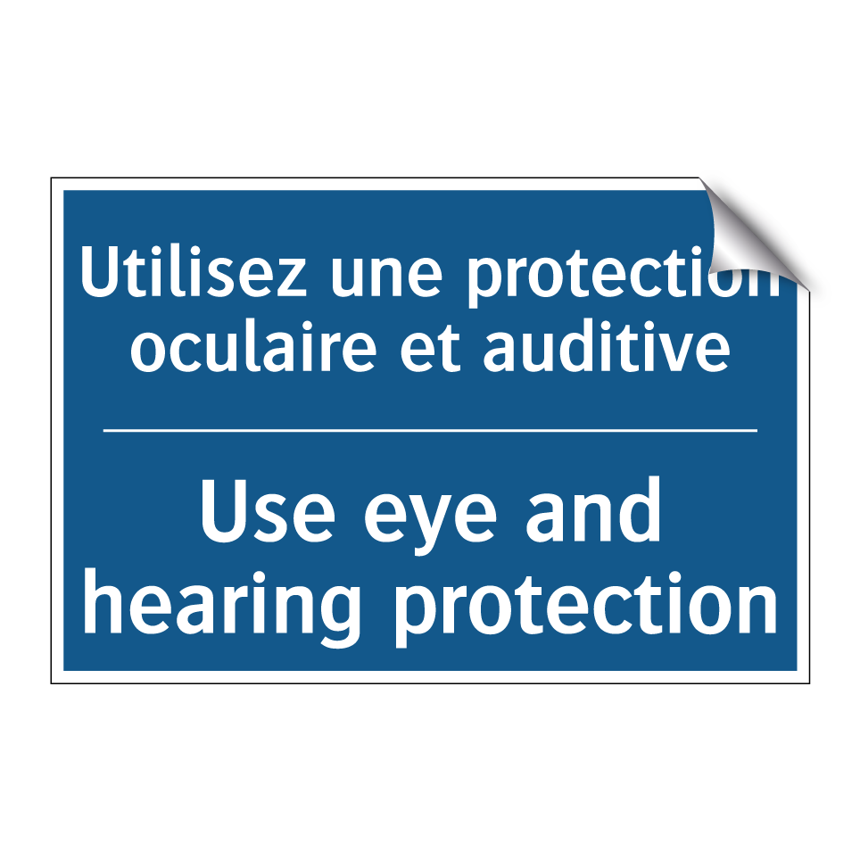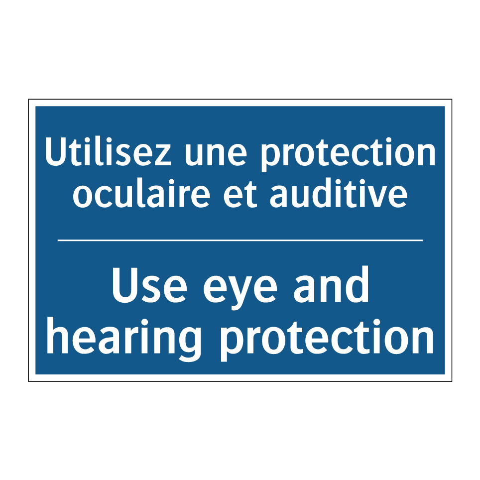Panneau d'obligation bilingue avec texte en français : "Utilisez une protection oculaire et auditive", et en anglais : "Use eye and hearing protection"
