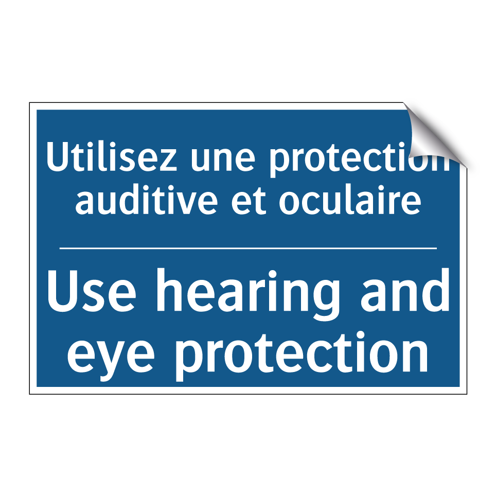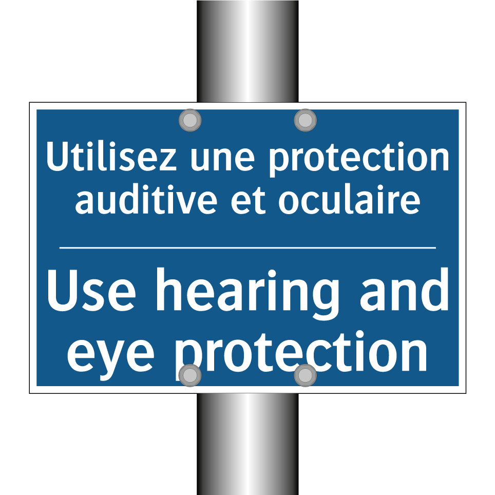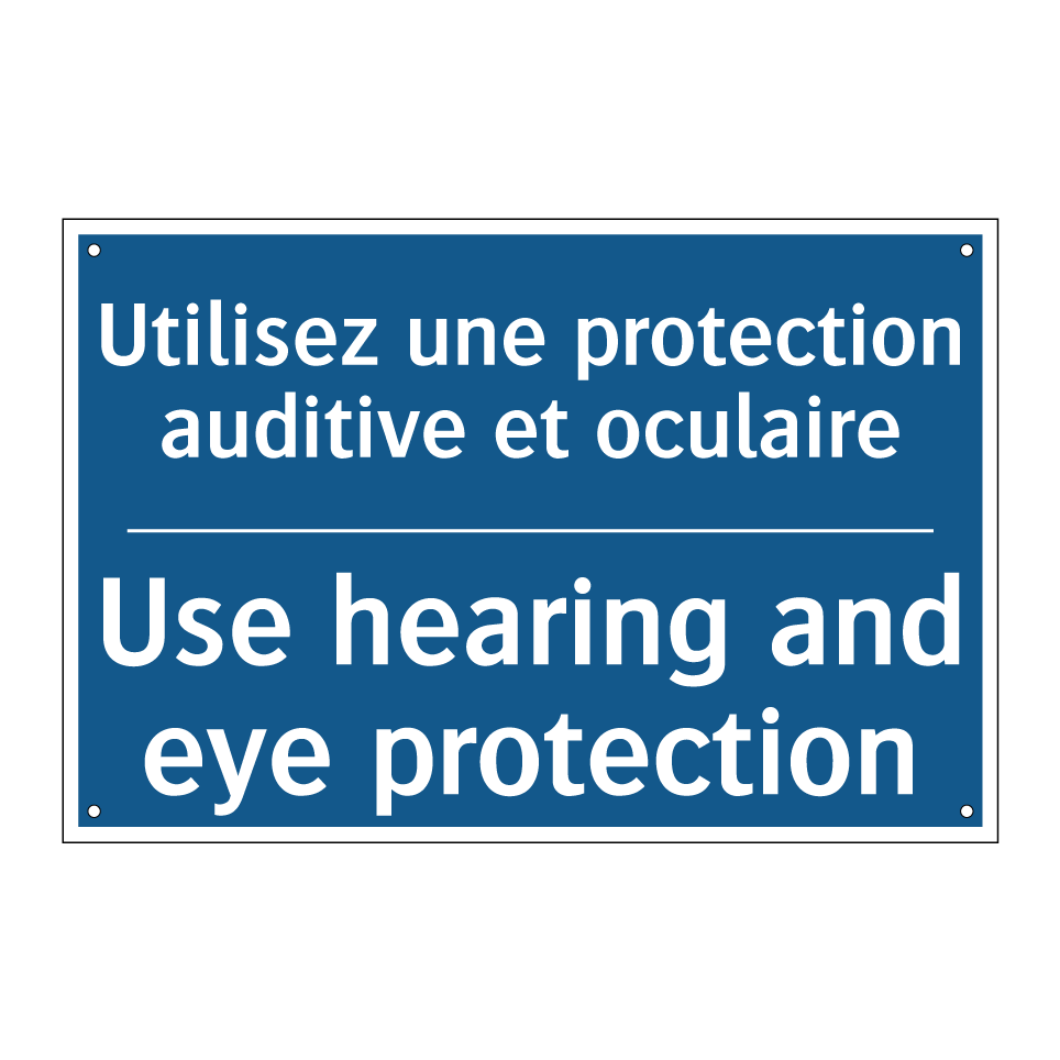 Panneau d'obligation bilingue avec texte en français : "Utilisez une protection auditive et oculaire", et en anglais : "Use hearing and eye protection"