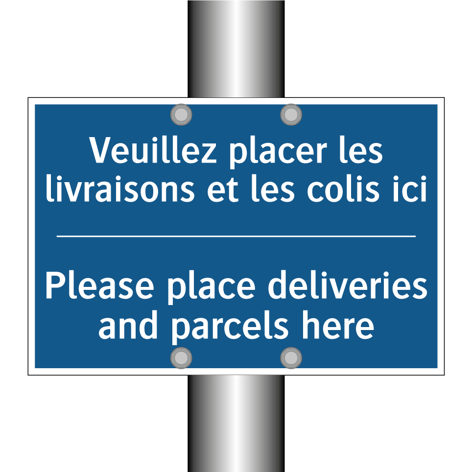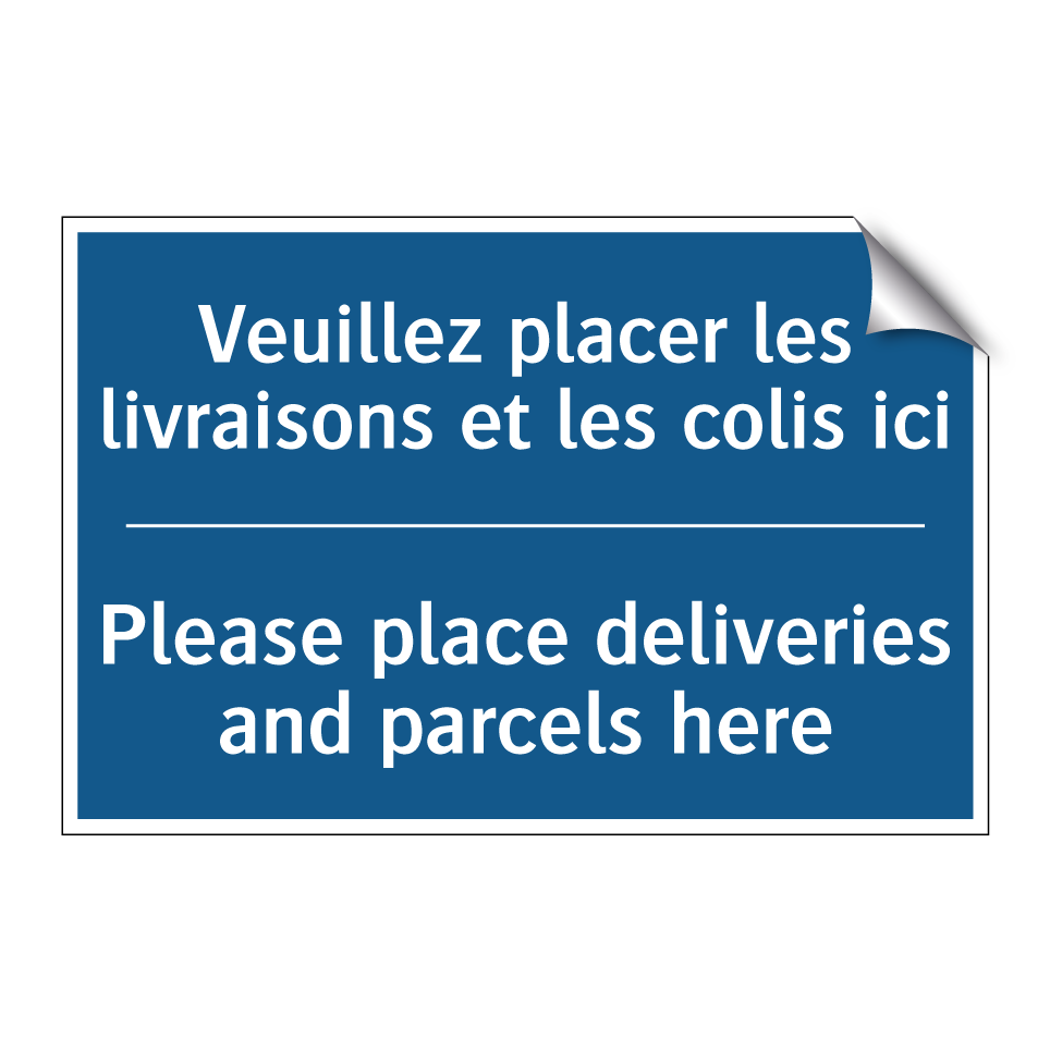Panneau d'obligation bilingue avec texte en français : "Veuillez placer les livraisons et les colis ici", et en anglais : "Please place deliveries and parcels here"