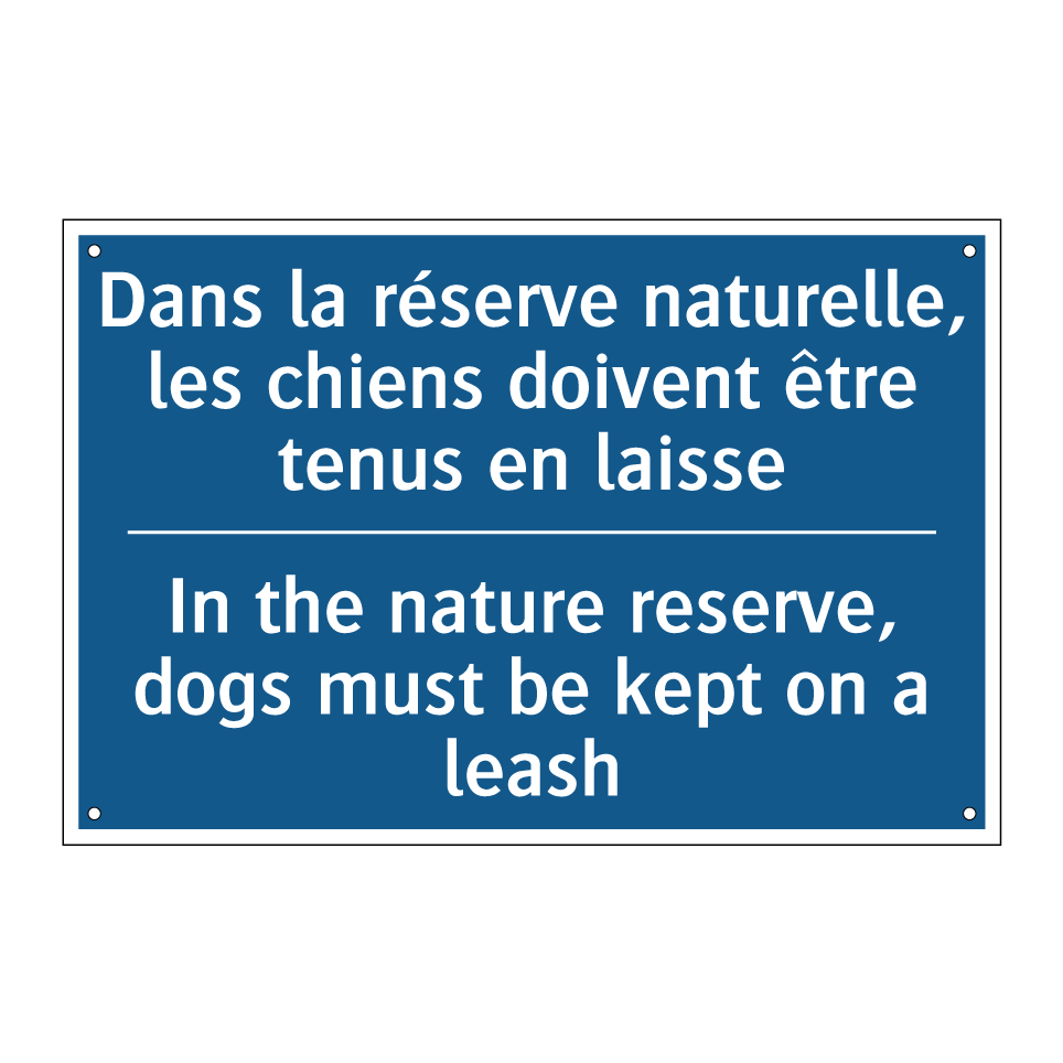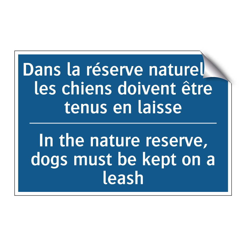 Panneau d'obligation bilingue avec texte en français : "Dans la réserve naturelle, les chiens doivent être tenus en laisse", et en anglais : "In the nature reserve, dogs must be kept on a leash"