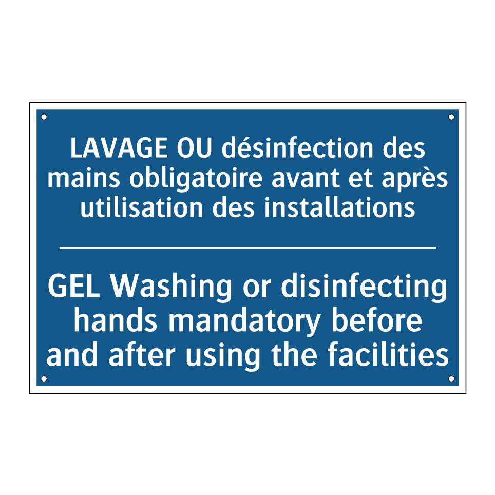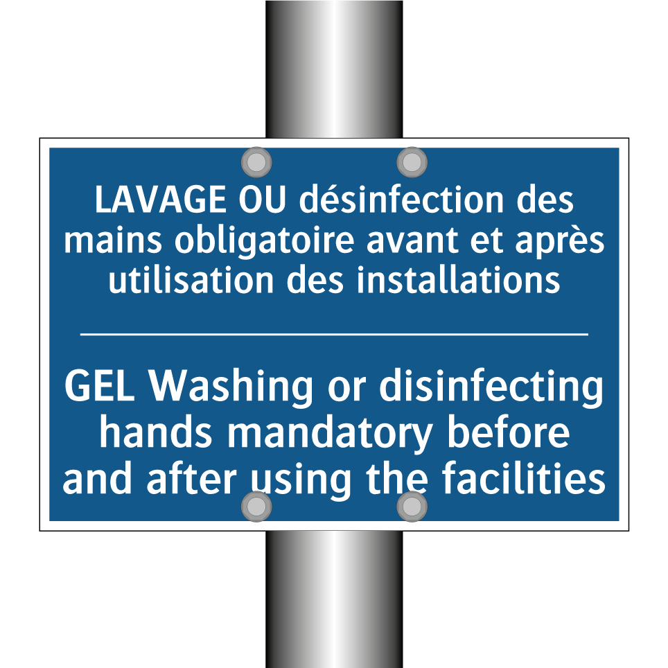 Panneau d'obligation bilingue avec texte en français : "LAVAGE OU désinfection des mains obligatoire avant et après utilisation des installations", et en anglais : "GEL Washing or disinfecting hands mandatory before and after using the facilities"
