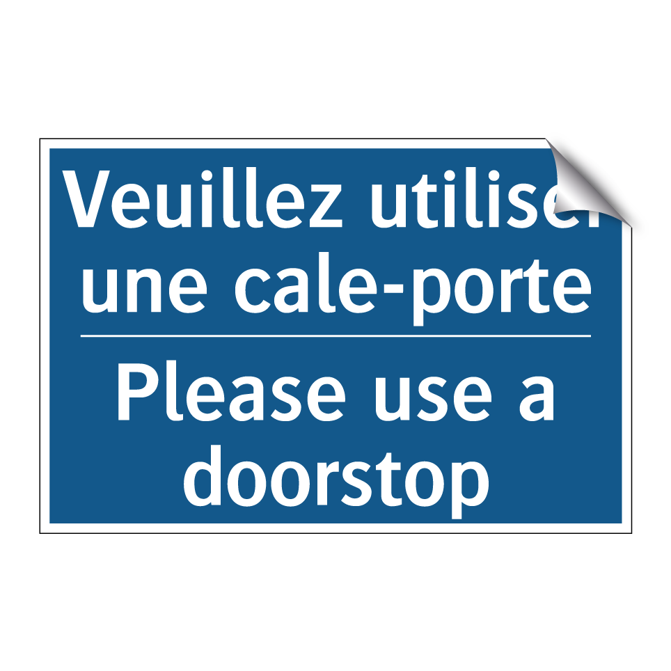 Panneau d'obligation bilingue avec texte en français : "Veuillez utiliser une cale-porte", et en anglais : "Please use a doorstop"