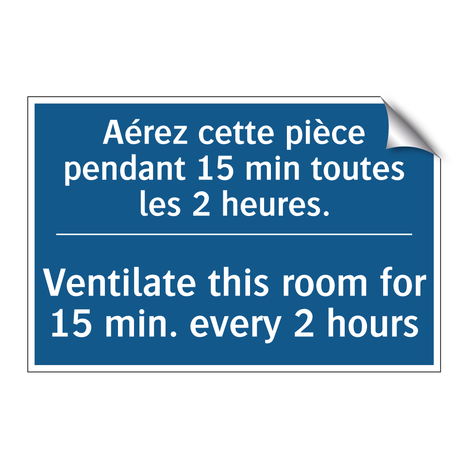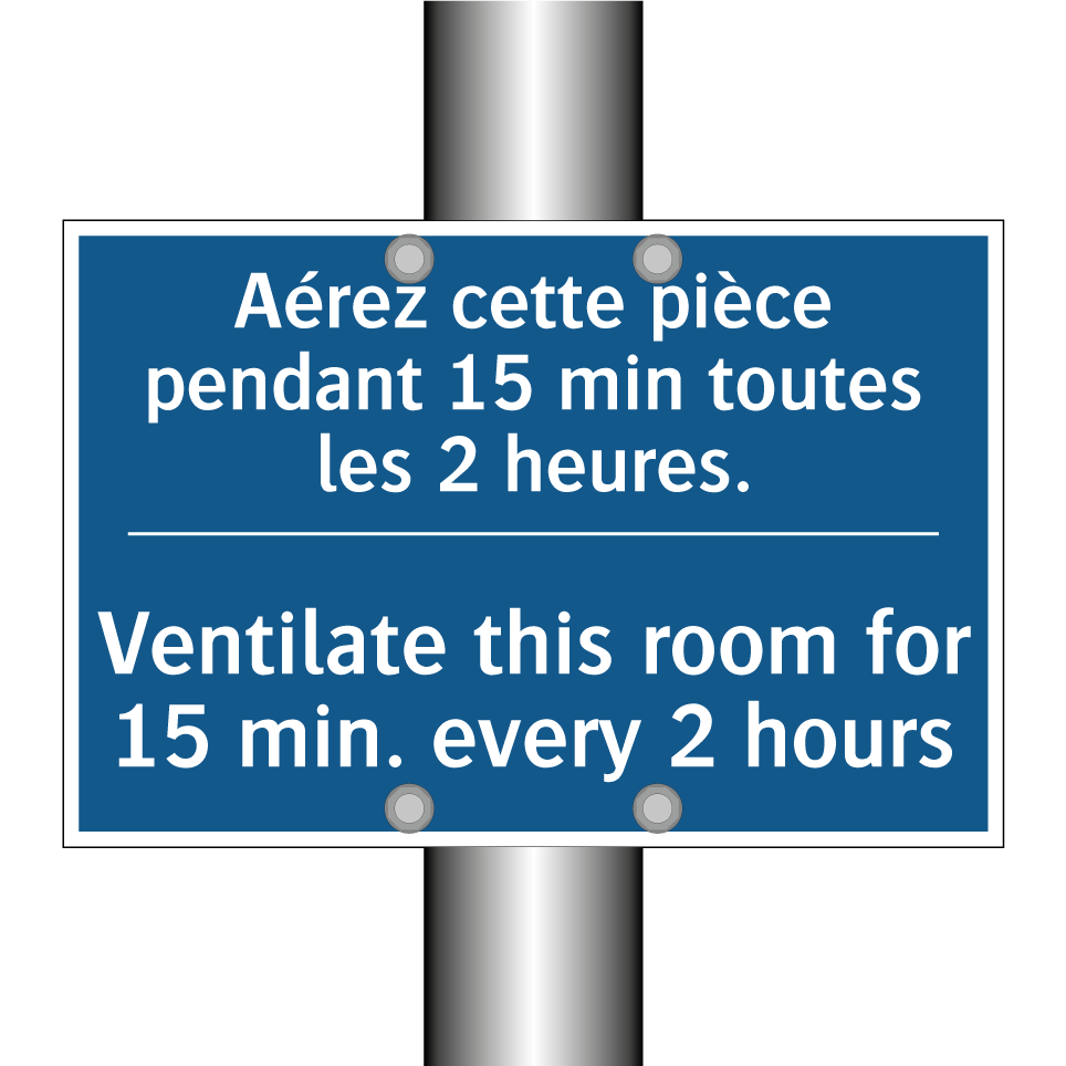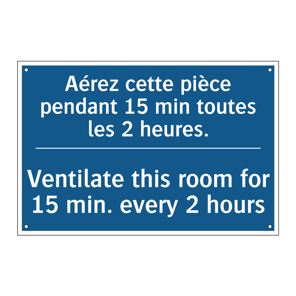 Panneau d'obligation bilingue avec texte en français : "Aérez cette pièce pendant 15 min toutes les 2 heures.", et en anglais : "Ventilate this room for 15 min. every 2 hours"