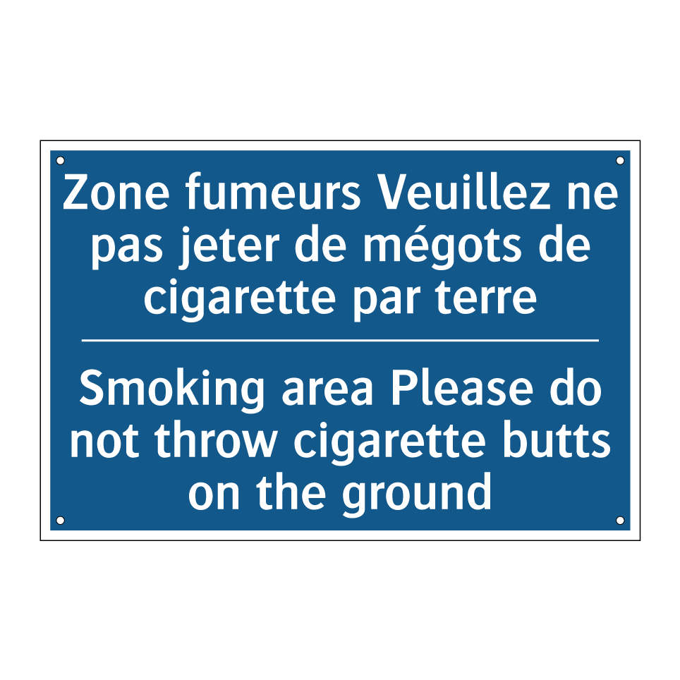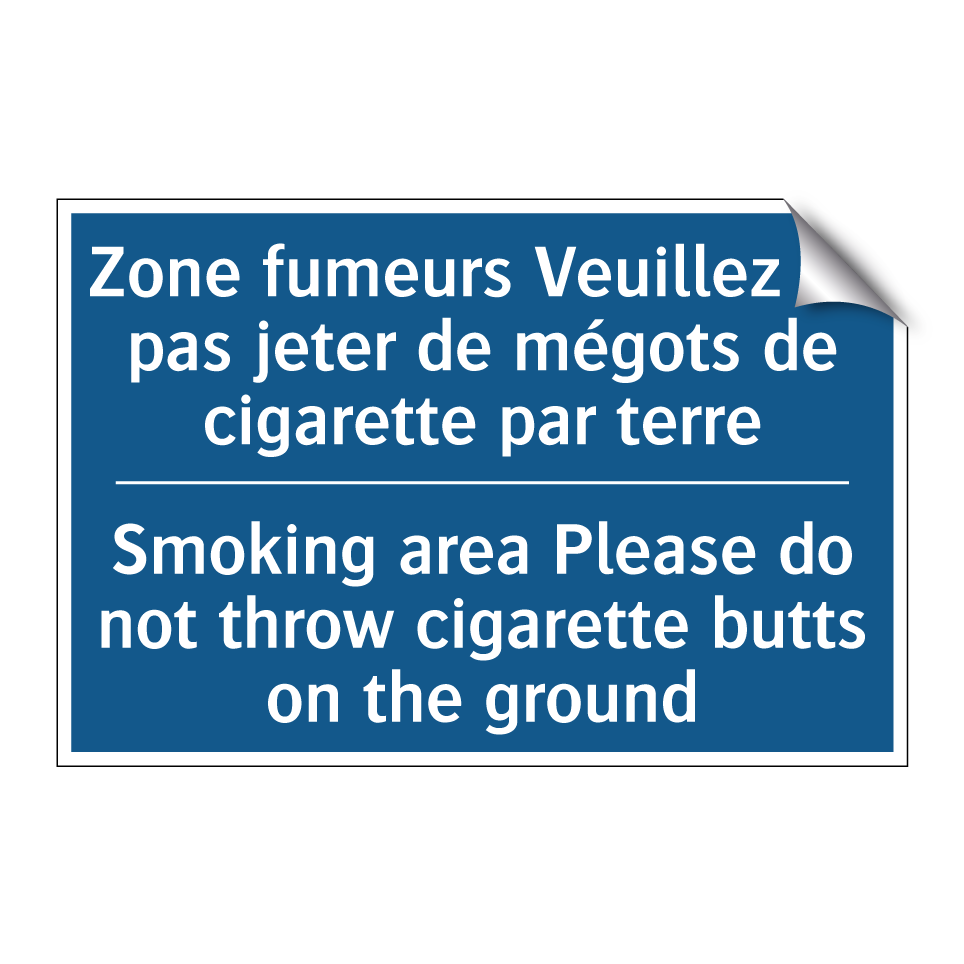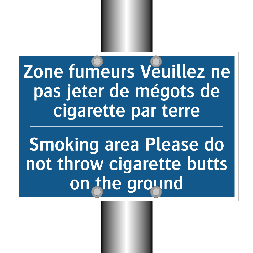 Panneau d'obligation bilingue avec texte en français : "Zone fumeurs Veuillez ne pas jeter de mégots de cigarette par terre", et en anglais : "Smoking area Please do not throw cigarette butts on the ground"