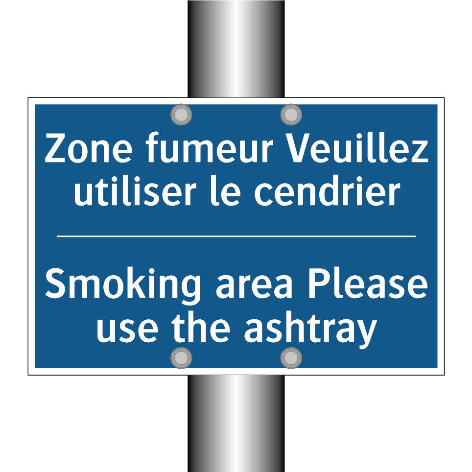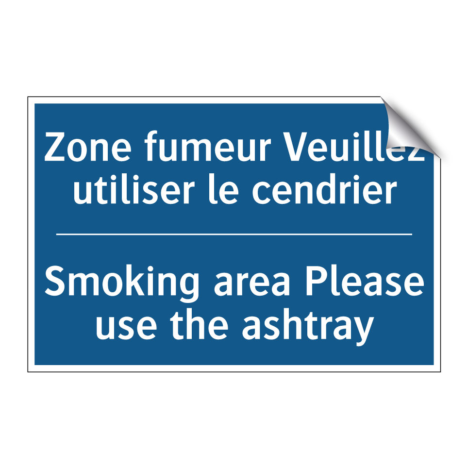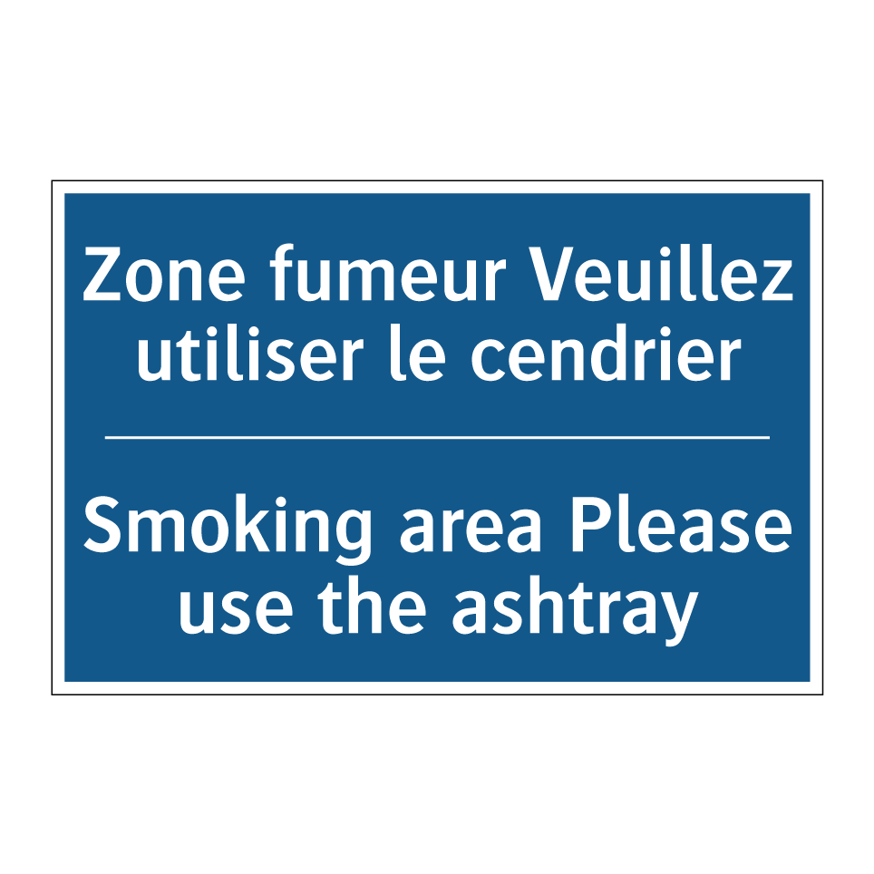 Panneau d'obligation bilingue avec texte en français : "Zone fumeur Veuillez utiliser le cendrier", et en anglais : "Smoking area Please use the ashtray"