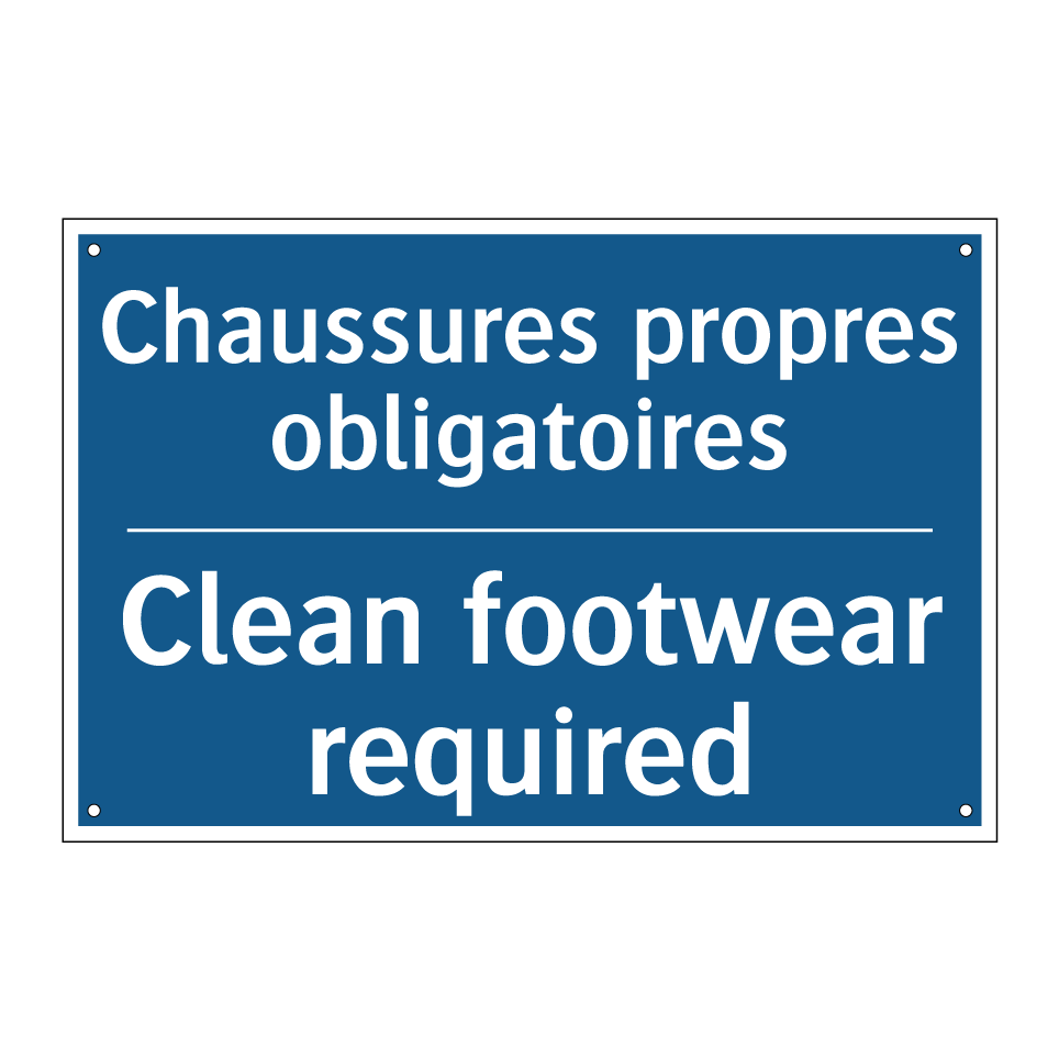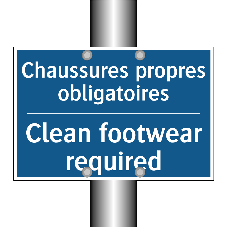 Panneau d'obligation bilingue avec texte en français : "Chaussures propres obligatoires", et en anglais : "Clean footwear required"