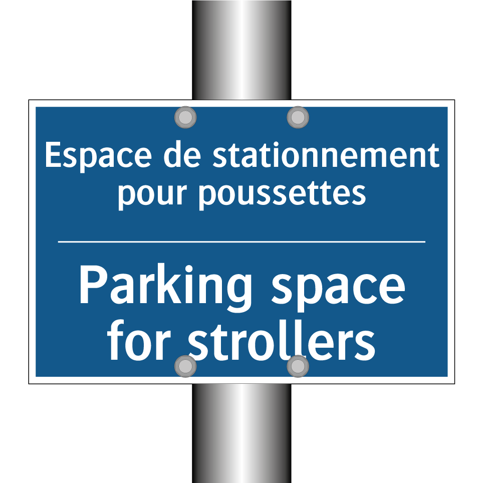 Panneau d'obligation bilingue avec texte en français : "Espace de stationnement pour poussettes", et en anglais : "Parking space for strollers"