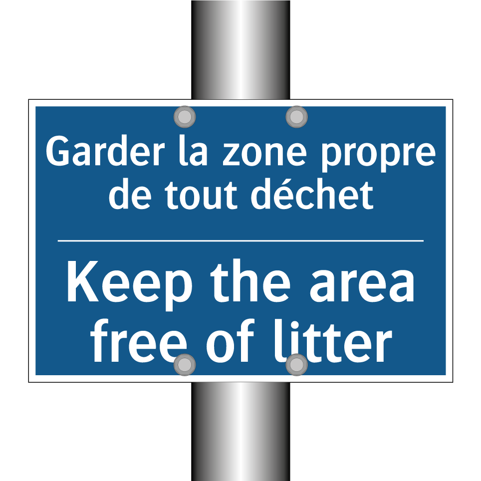 Panneau d'obligation bilingue avec texte en français : "Garder la zone propre de tout déchet", et en anglais : "Keep the area free of litter"