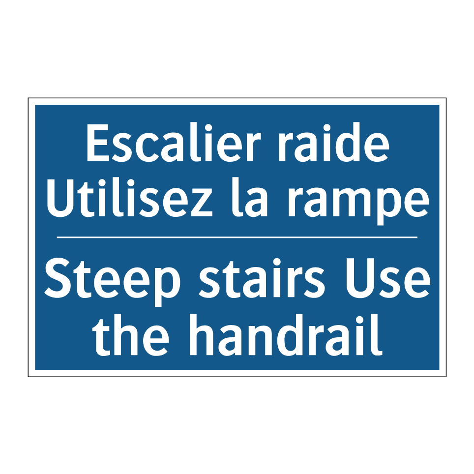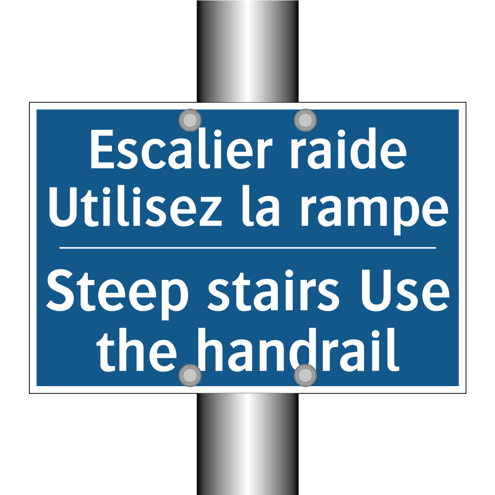 Panneau d'obligation bilingue avec texte en français : "Escalier raide Utilisez la rampe", et en anglais : "Steep stairs Use the handrail"
