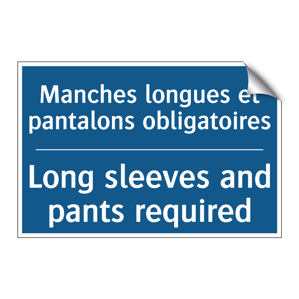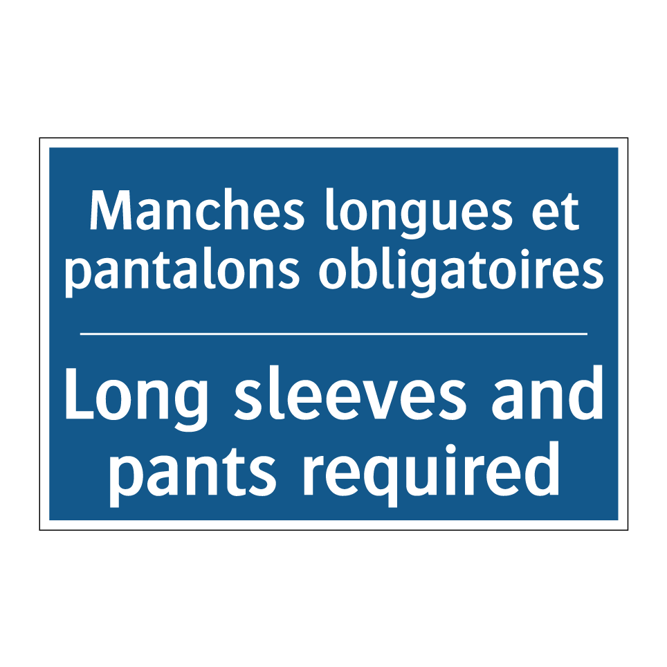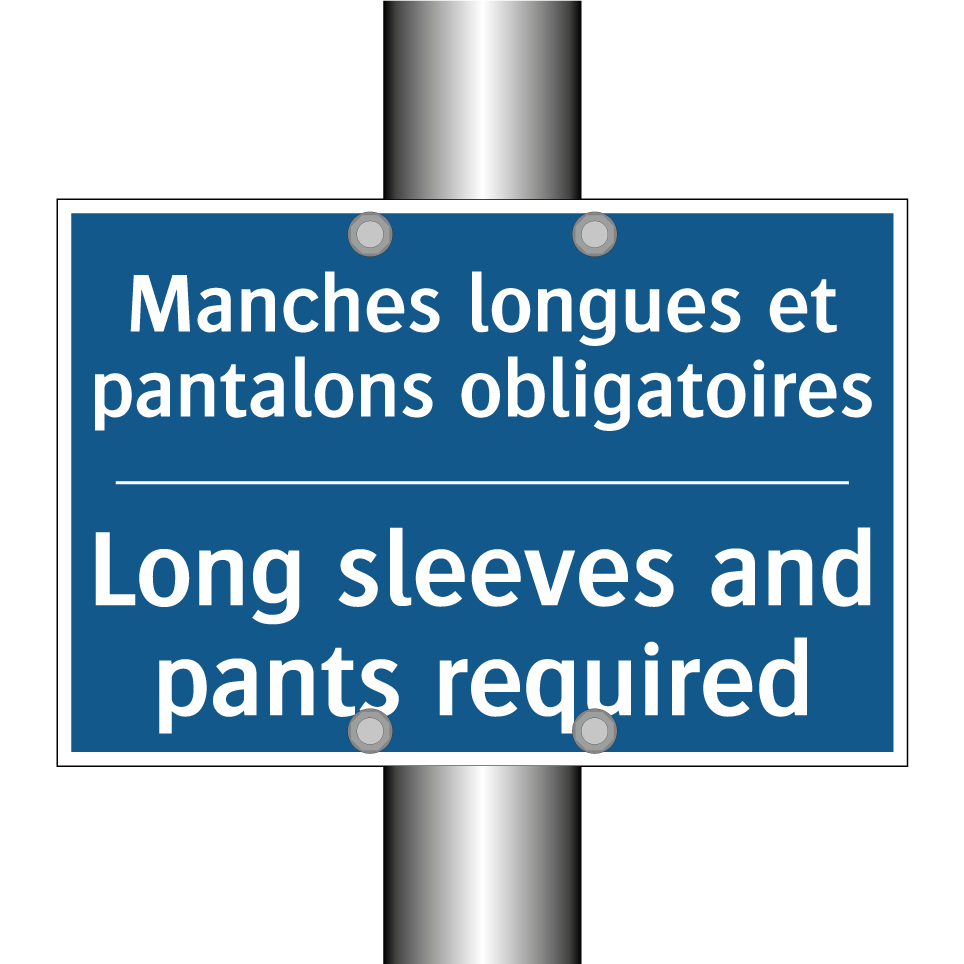 Panneau d'obligation bilingue avec texte en français : "Manches longues et pantalons obligatoires", et en anglais : "Long sleeves and pants required"