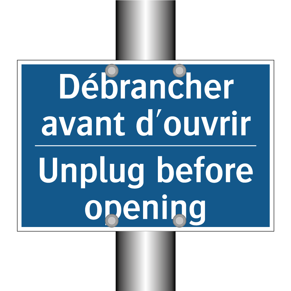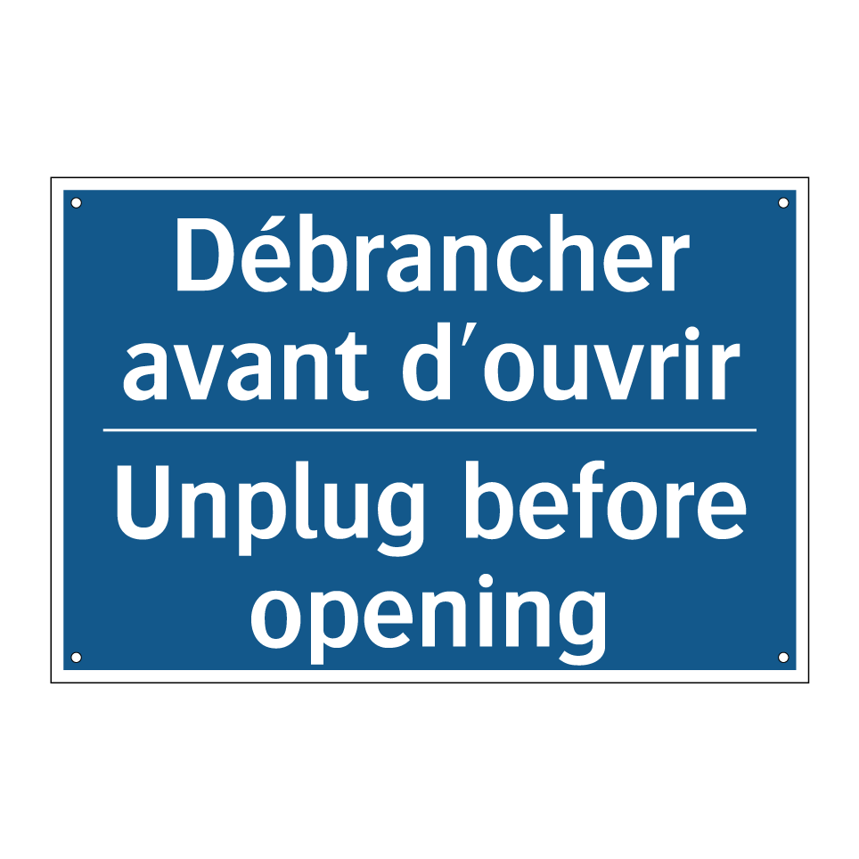 Panneau d'obligation bilingue avec texte en français : "Débrancher avant d'ouvrir", et en anglais : "Unplug before opening"