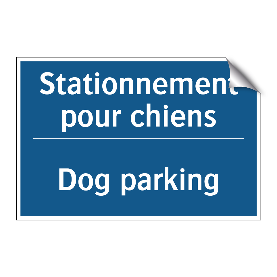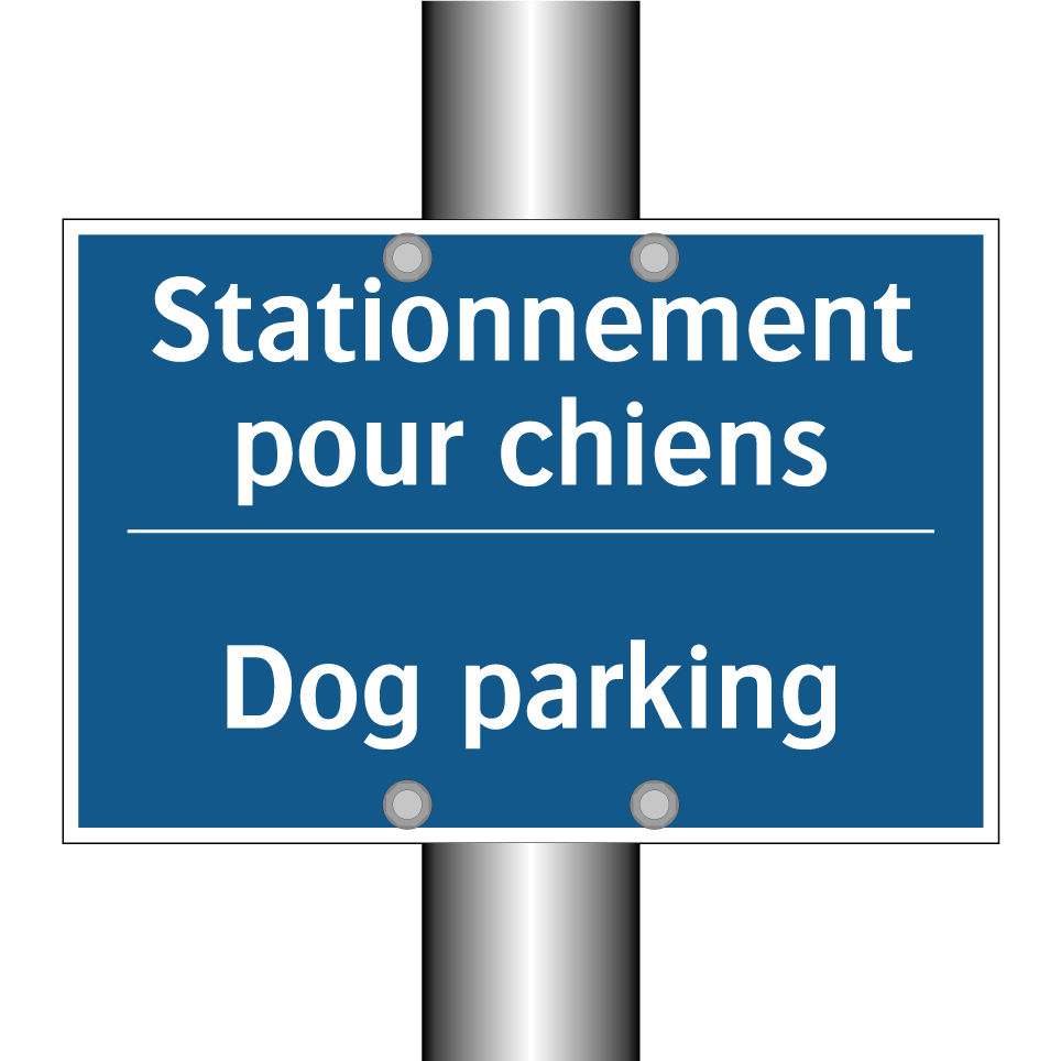 Panneau d'obligation bilingue avec texte en français : "Stationnement pour chiens", et en anglais : "Dog parking"