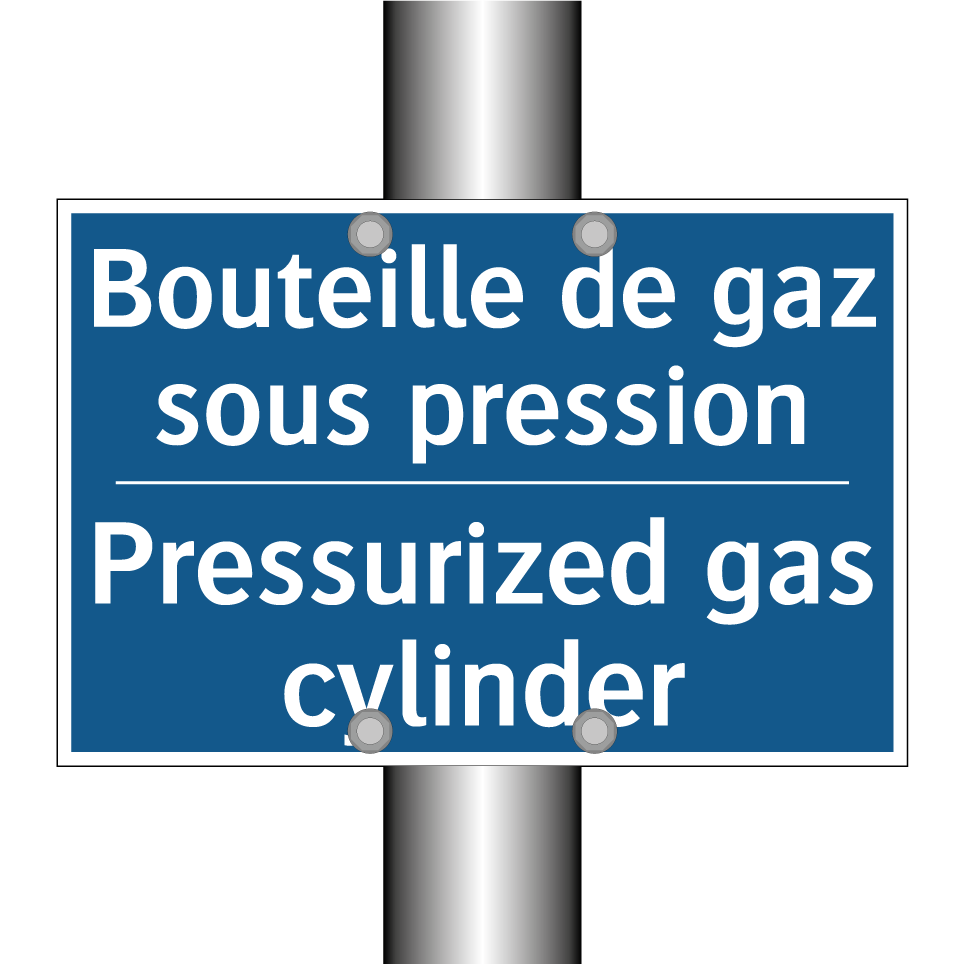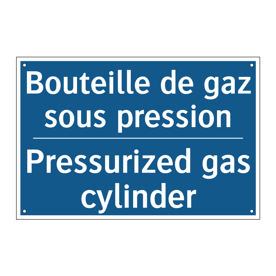 Panneau d'obligation bilingue avec texte en français : "Bouteille de gaz sous pression", et en anglais : "Pressurized gas cylinder"