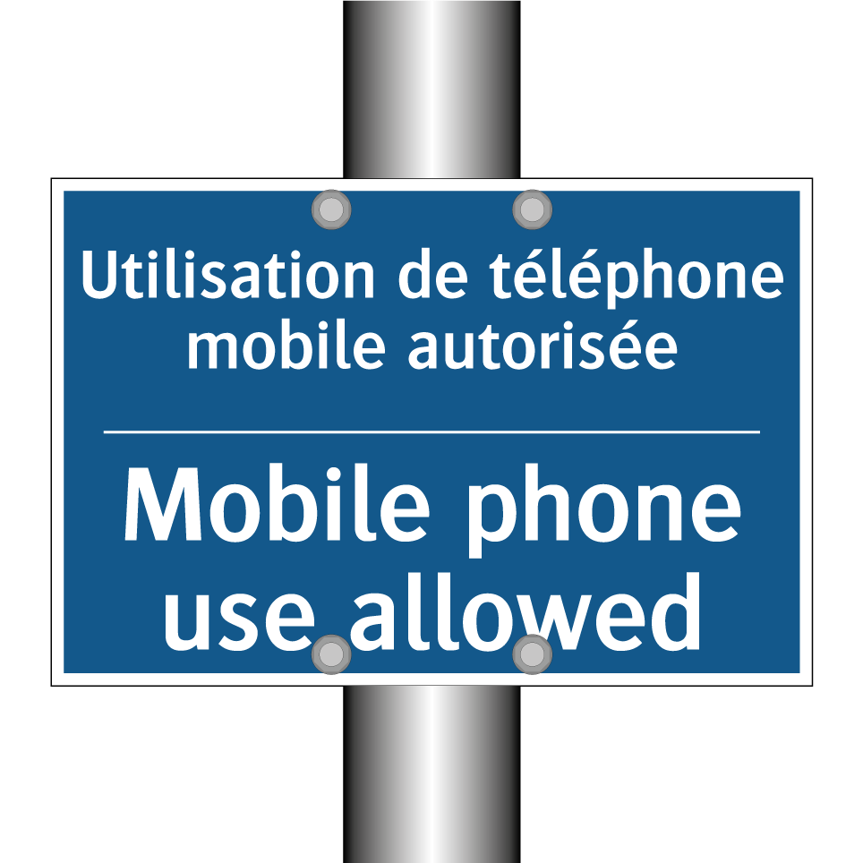 Panneau d'obligation bilingue avec texte en français : "Utilisation de téléphone mobile autorisée", et en anglais : "Mobile phone use allowed"