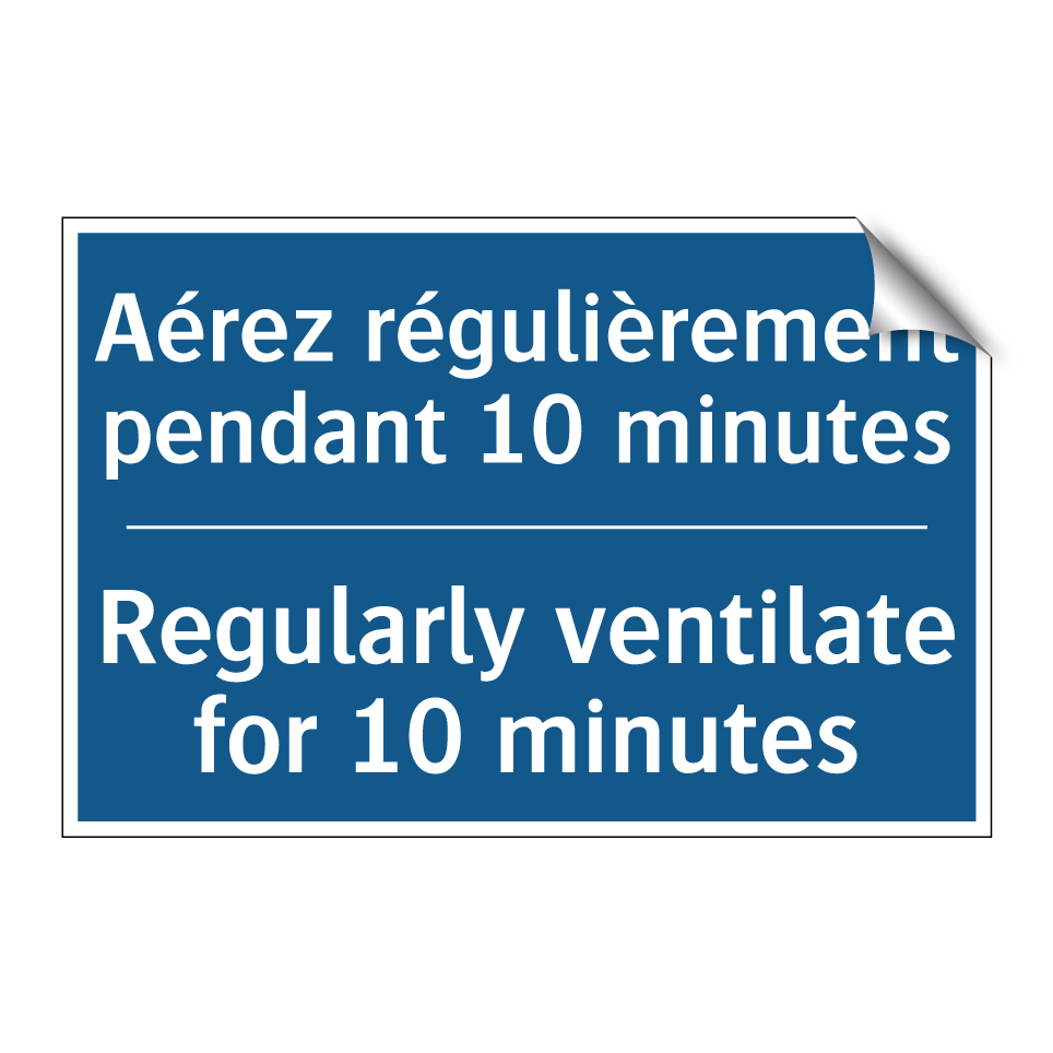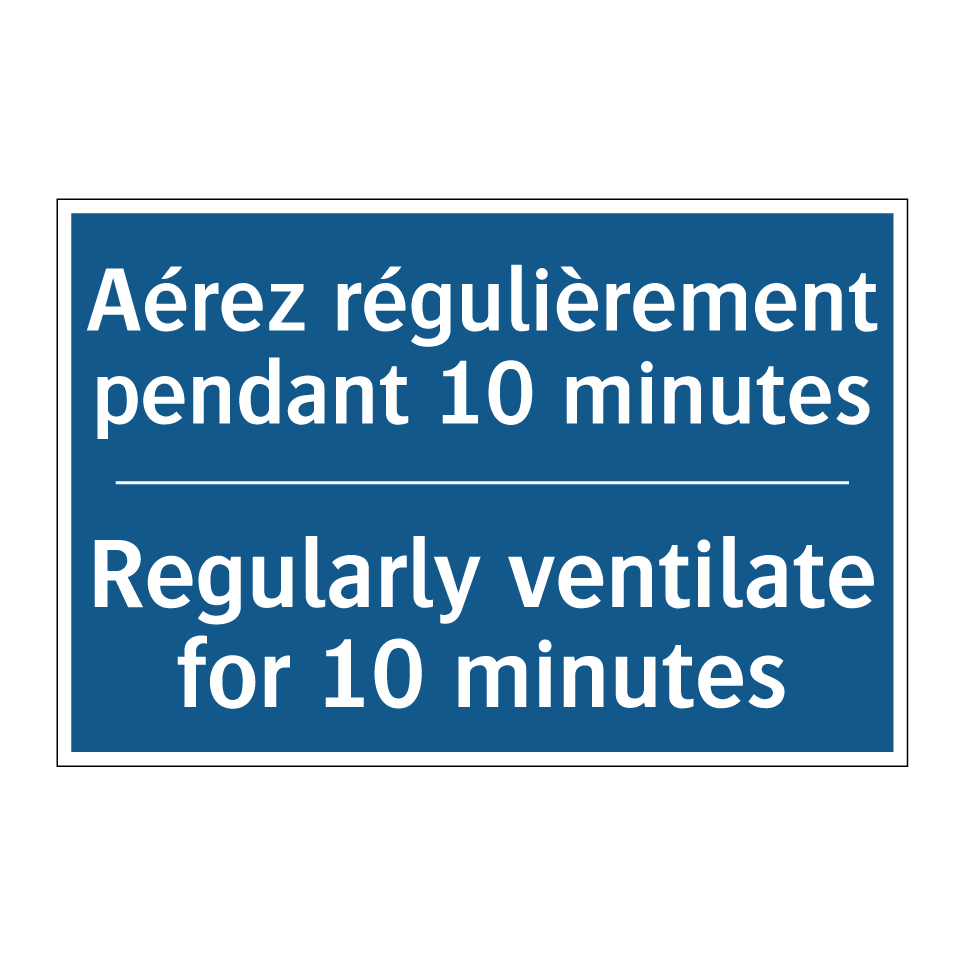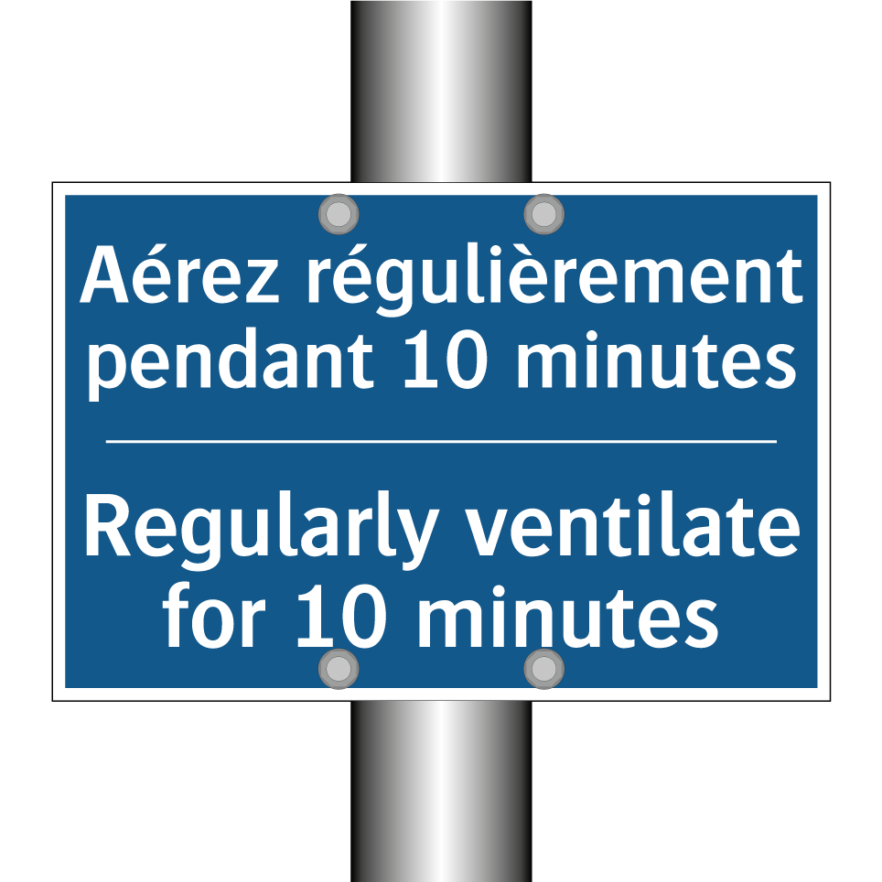 Panneau d'obligation bilingue avec texte en français : "Aérez régulièrement pendant 10 minutes", et en anglais : "Regularly ventilate for 10 minutes"
